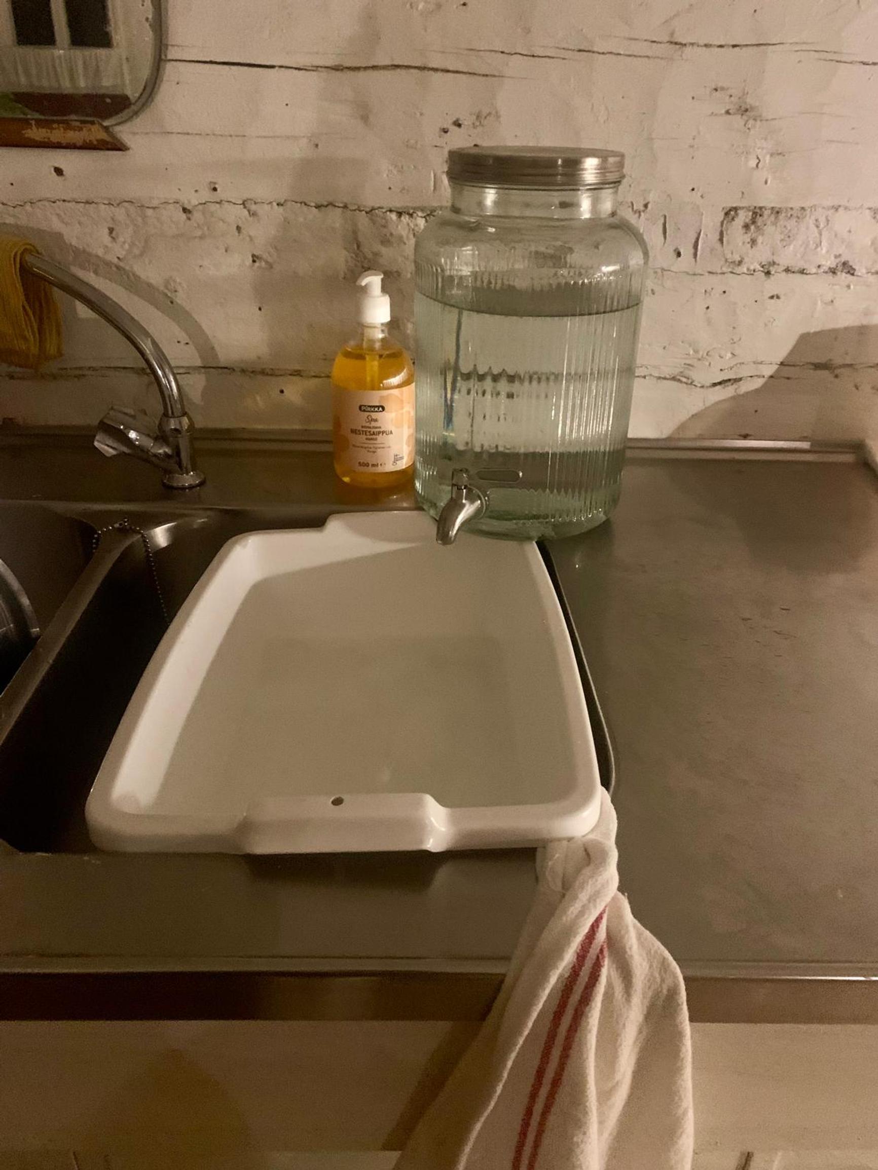 Pihalla on kesävesihana ja se pitää sulkea, kun pakkaset alkavat. Suunnitelmissani on tehdä luhtiin lämmitetty ja putkitettu pesutila, mutta siihenkään ei ole budjettia vielä aikoihin.