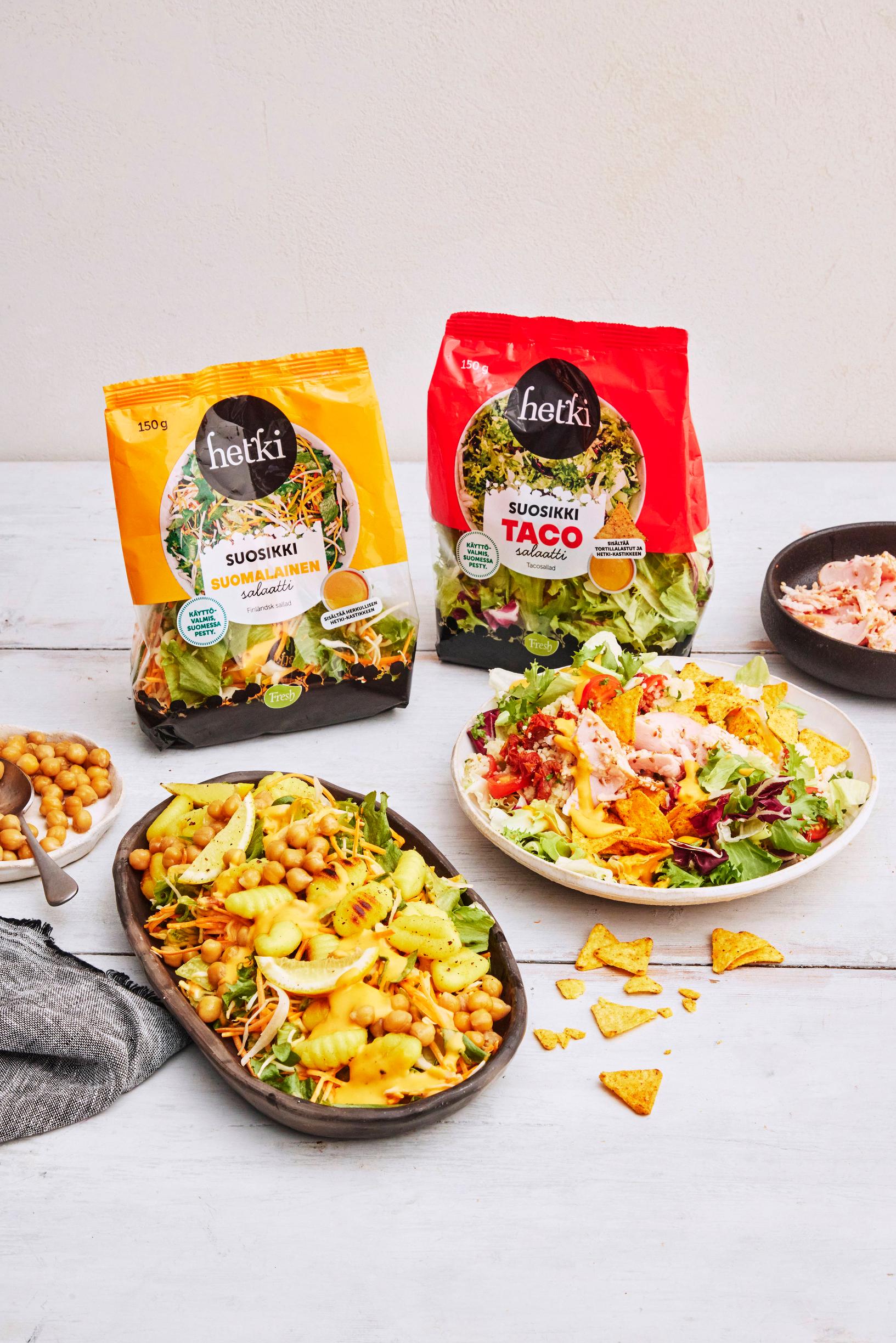 Hetki Suosikki -salaattipussit tekevät kokkaamisesta vaivatonta: ne ovat valmiiksi pestyjä, sopivan kokoisia ja makumaailmaltaan monipuolisia. Kun lisäät joukkoon nopeat lisukkeet, syntyy ravitseva, herkullinen ja hävikitön ateria ilman ylimääräistä vaivaa.