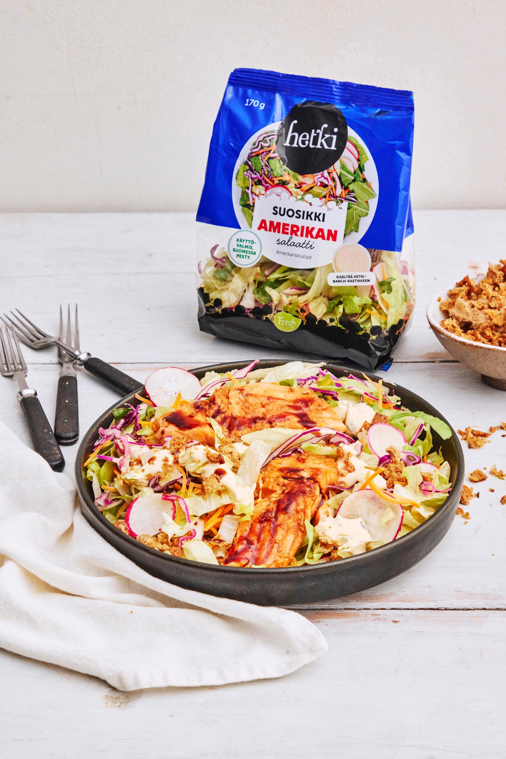 3. Amerikan salaatti + teriyakilohi + yrttileipämuru