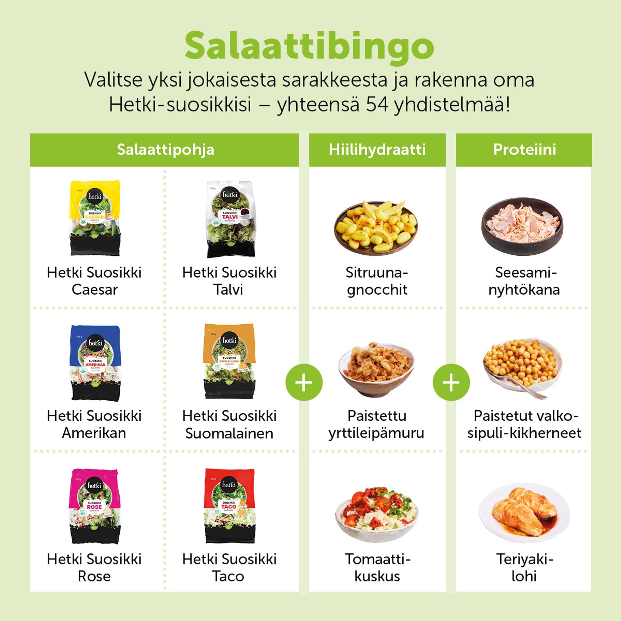 Valitse kätevästä taulukosta yksi kuudesta erilaisesta Hetki Suosikki -valmissalaattipussista, yksi kolmesta hiilihydraattivaihtoehdosta ja yksi kolmesta proteiiniehdotuksesta – näin sinulla on valmis ateria!
