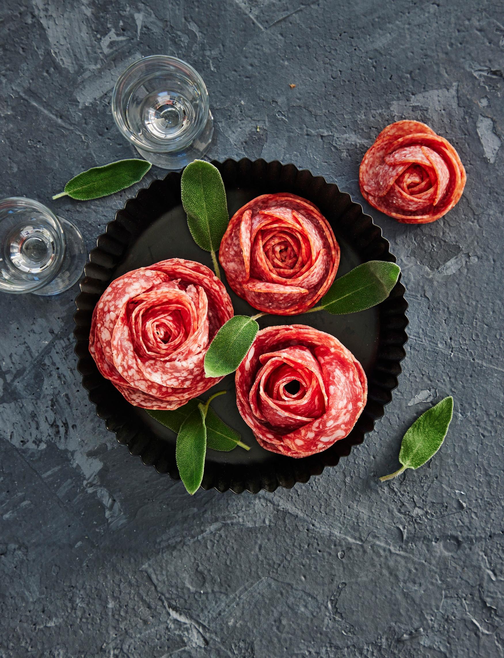 Salamiruusu syntyy sukkelasti lasin avulla – näin teet hauskat koristeet voileipäkakkuun tai alkupalalautaselle