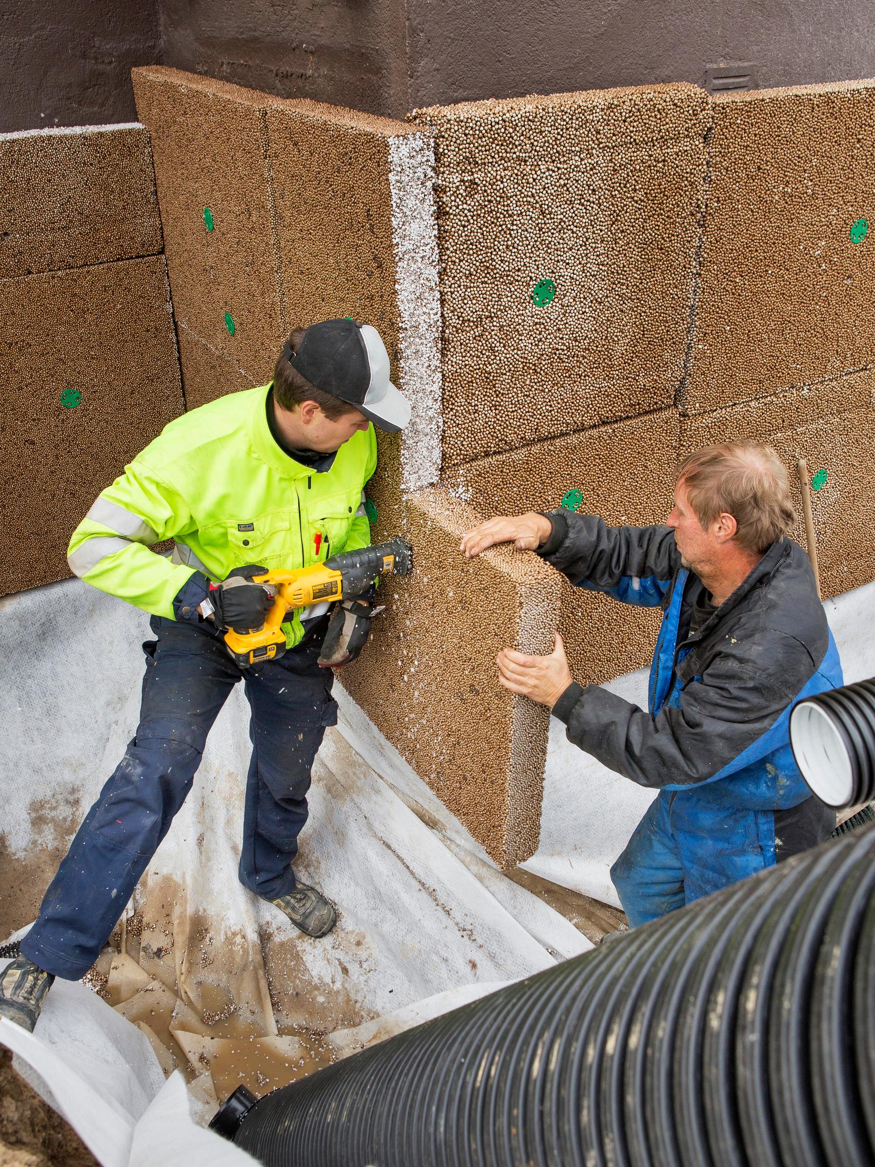 – Perusmuuri saadaan eristelevyillä lämpimäksi, ja sen kastepiste siirtyy betonimuurista ulospäin. Erillistä sepelistä tehtyä pystysalaojitusta ei tarvita, koska levy salaojittaa sekä pysty- että vaakasuuntaan.