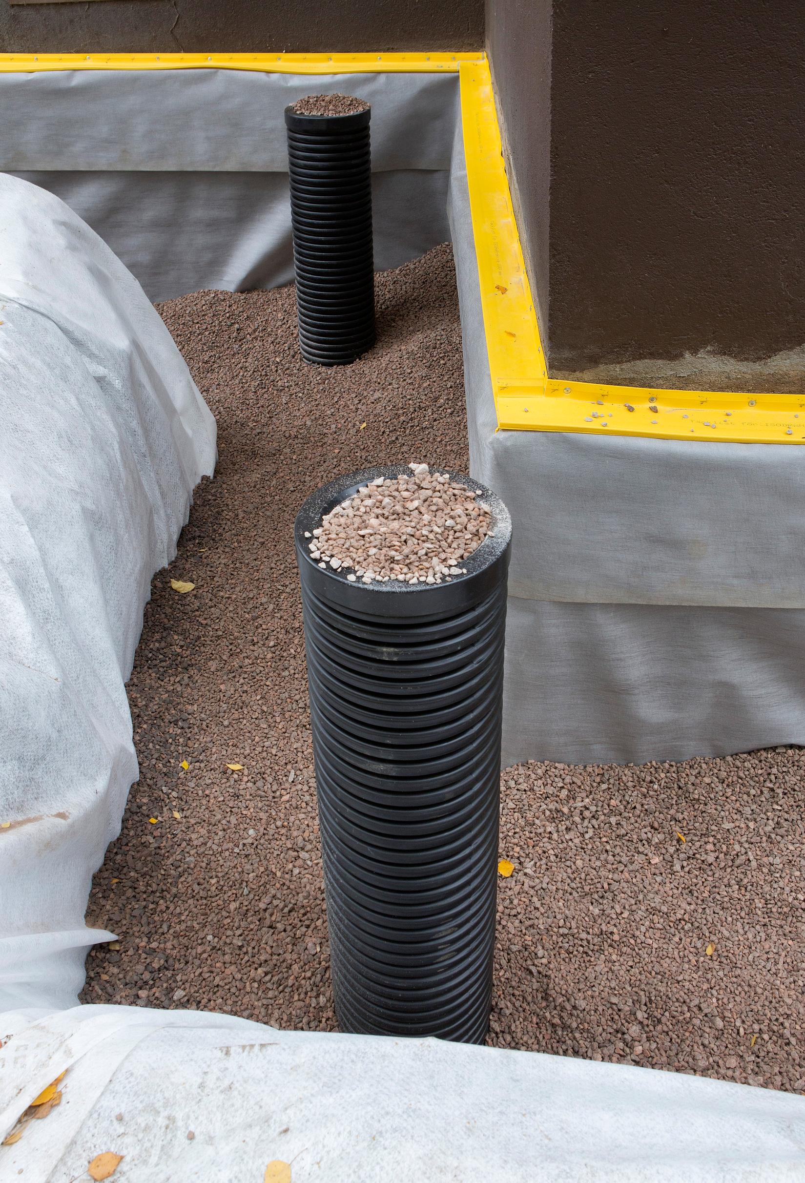 - Ellei käytetä salaojittavaa kosteus- ja lämmöneristelevyä vaan perusmuurilevyä ja lämmöneristettä tulee lämmöneristeen ja kaivumaan välissä olla toimimisen varmistamiseksi riittävä kerros salaojitussoraa, joka johtaa maanpinnalta mahdollisesti vajoavan veden salaojaputkiin.