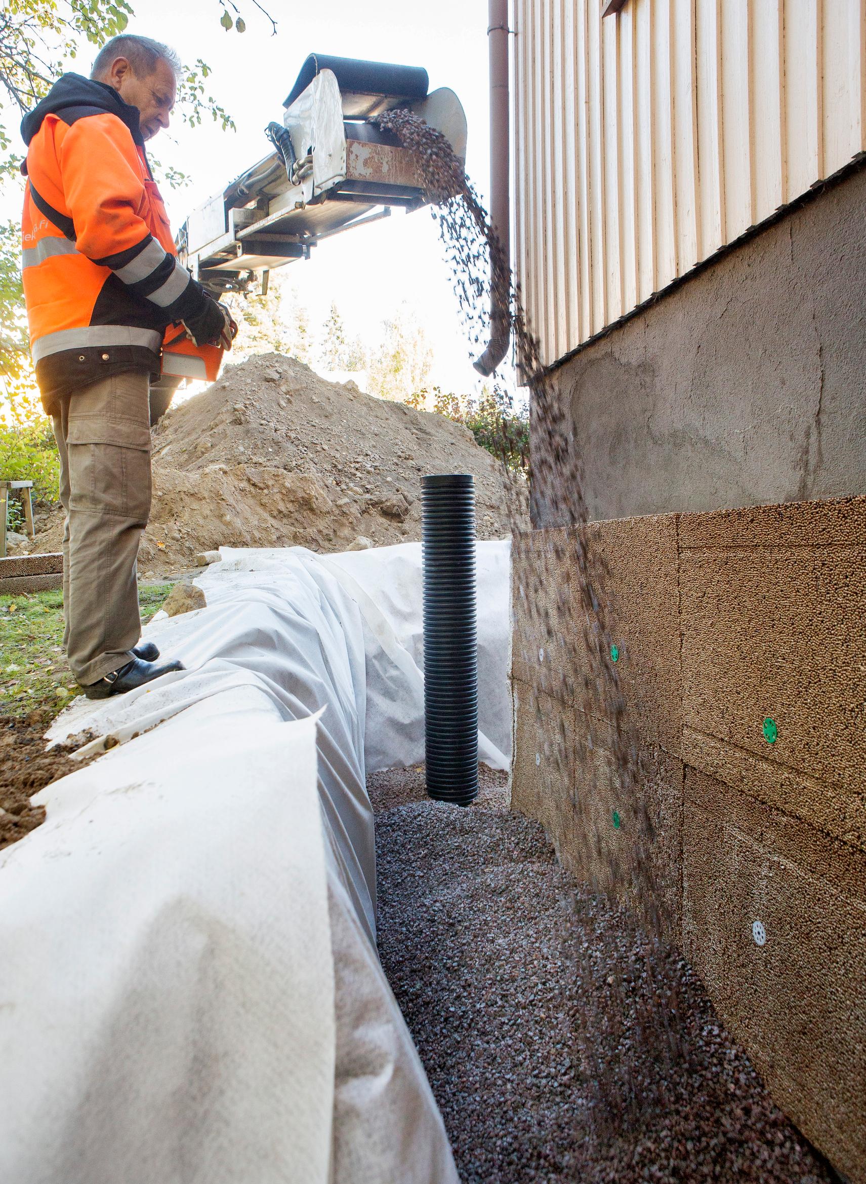 Seuraavina päivinä perusmuurin murtumat korjataan ja muhkurat tasataan valamalla, minkä jälkeen asennetaan eristelevyt ja levyjen ulkopintoihin tukkeutumista estävä suodatinkangas. Sama kangas ulotetaan alapäästään kaivannon pohjalle ja ulkosivustalle torjumaan puiden juurien tunkeutumista perustuksen läheisyyteen. Tästä jatketaan sepelitäyttöön sekä salaojaputkien, salaojien tarkastuskaivojen ja rännikaivojen asentamiseen.