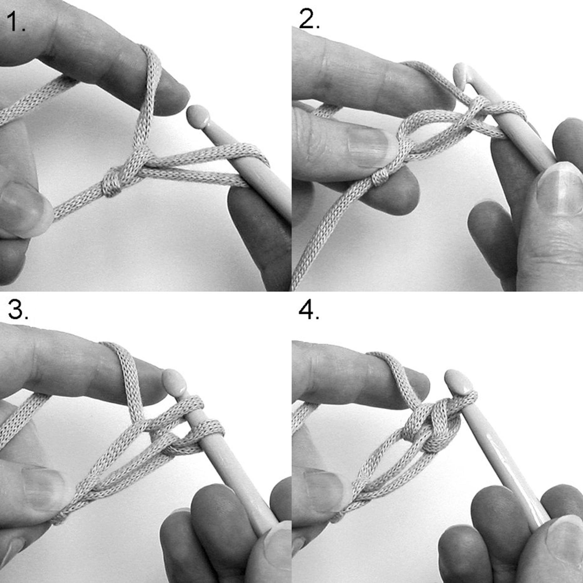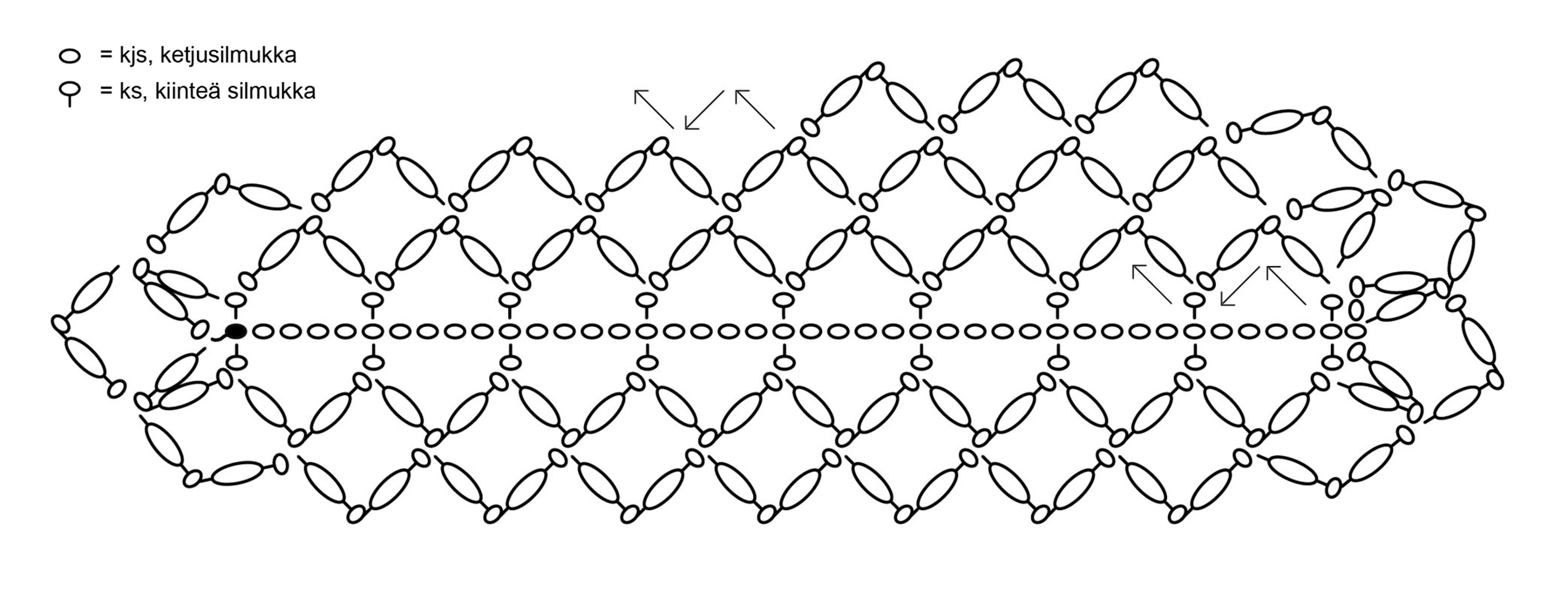 1. krs Virkkaa 1 ks 3. kjs:aan koukusta lukien, virkkaa 1 salomoninsolmu näin: **venytä koukulla oleva silmukka noin 2 cm:n mittaiseksi, ota lk koukulle ja vedä se venytetyn silmukan läpi, vie sitten koukku venytetyn silmukan alimman langan ali, ota lk koukulle ja virkkaa 1 ks*, toista **–* vielä kerran, jätä 4 kjs väliin ja virkkaa 1 ks**, toista **–** vielä 7 kertaa, virkkaa sitten 2 ss krs:n viimeiseen s:aan. Jatka virkkaamalla 8 ss aloitusketjun toiseen reunaan, edellisten silmukoiden vastakkaiselle puolelle, ja lisää lopuksi toiseen päätyyn taas 2 ss näin: 1 ss 2. kjs:aan ja 1 ss 1. kjs:aan = 20 ss.