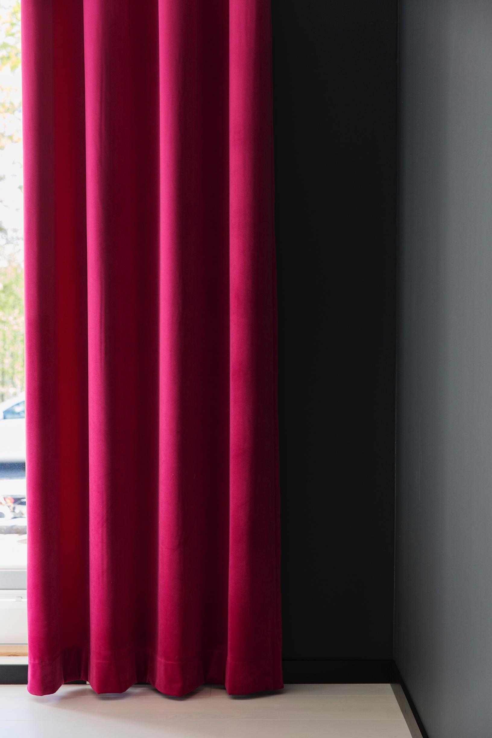 Näyttävän punaiset samettiverhot eivät jää taustalle, vaan ovat iso osa sisustusta. Niistä on myös käytännön hyötyä: pehmeä kangas vähentää tehokkaasti kodin kaikua. Jos verhot vielä vuoraa toisella kankaalla, niistä saa varmasti pimentävät. Loistavia ominaisuuksia makuuhuoneeseen!