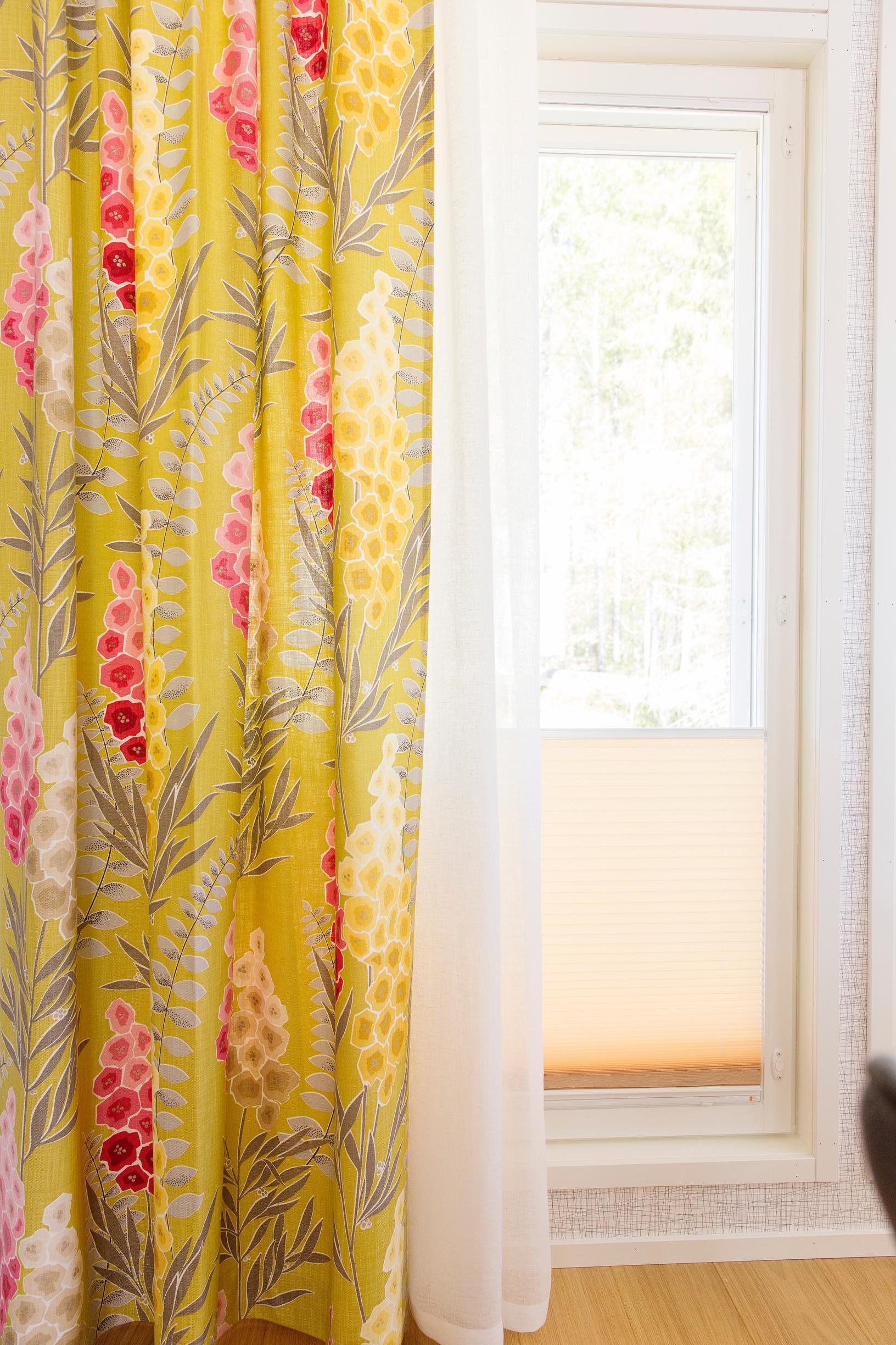 Tässä ikkunassa on kolme erillistä verhoa. Päällimmäisenä on hehkuvan värikäs, kesämekon mieleen tuova kangas, joka antaa koko sisustukselle 1950-luvun tunnun. Keskimmäisenä oleva valoverho pehmentää kokonaisuutta. Alimpana ikkunanpokassa on vielä vekkikaihdin, jota voi nostaa ja laskea molemmista päistään. Sillä on helppo suojautua auringon porotukselta ja ohikulkijoiden katseilta.
