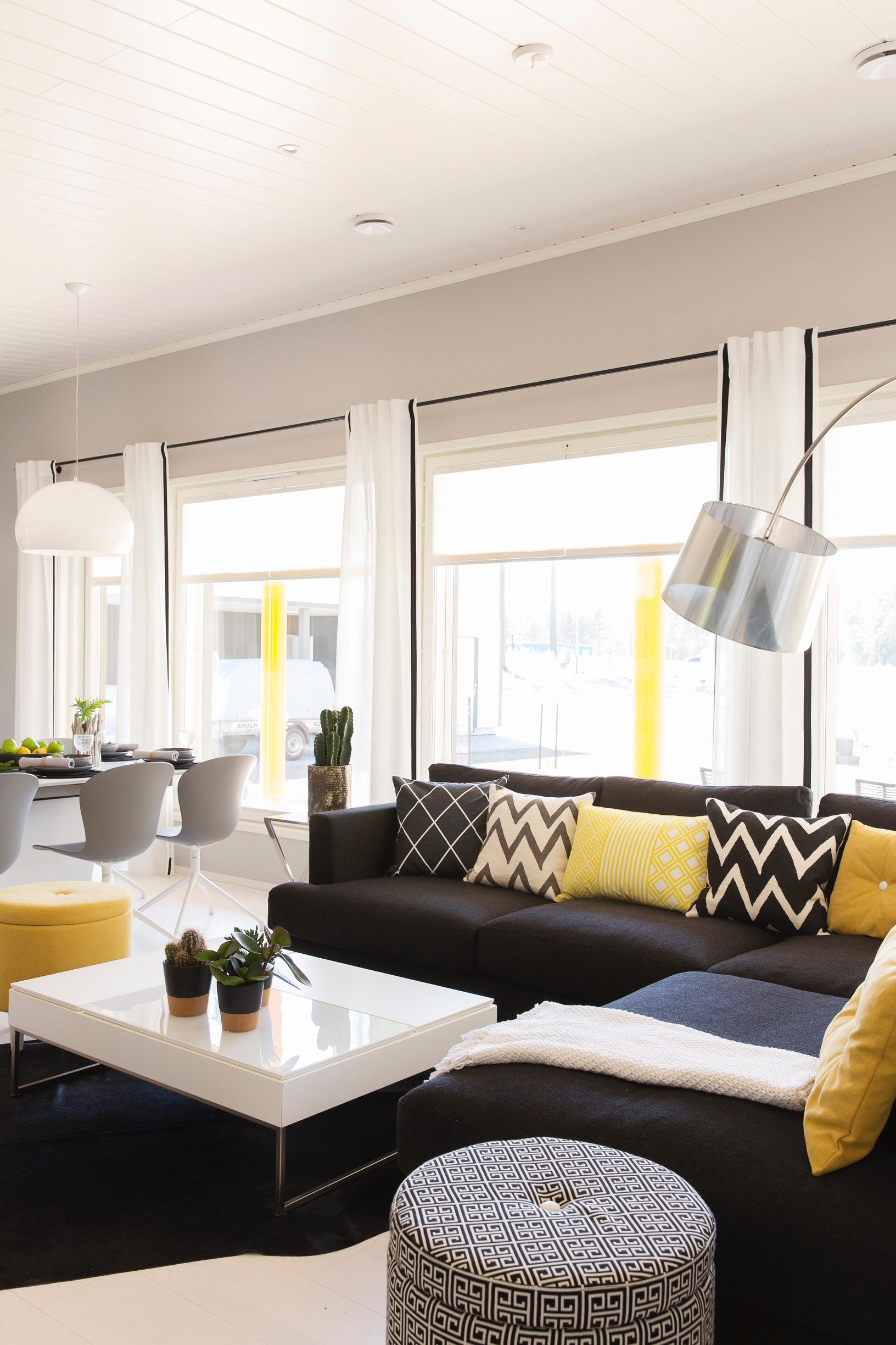 Tavalliset verhot – tai ei sittenkään! Musta kaitale läpikuultavan kevyen kankaan helmassa antaa ryhtiä ja liittää sen muuhun sisustukseen. Raskaampaa materiaalia olevana se myös parantaa verhon laskeutuvuutta. Tämä idea on helppo toteuttaa omassakin kodissa!