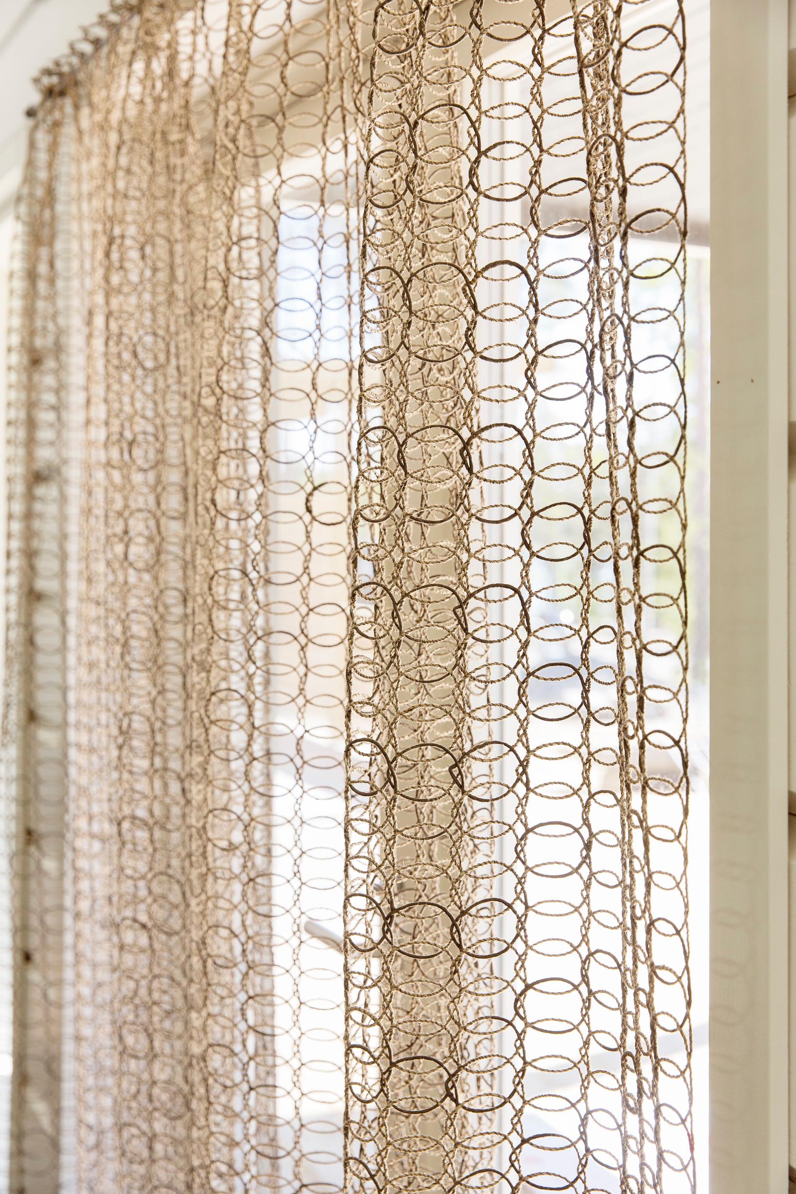 Epäsäännöllinen, patinoitunut ja punotun näköinen verkko lisää moderniin olohuoneeseen iättömän aikaulottuvuuden. Verkkoverho päästää valon lävitseen, mutta pehmentää silti ikkunoiden kovia ja täsmällisiä linjoja. Tällaiset kontrastit näyttävät aina hyvältä.