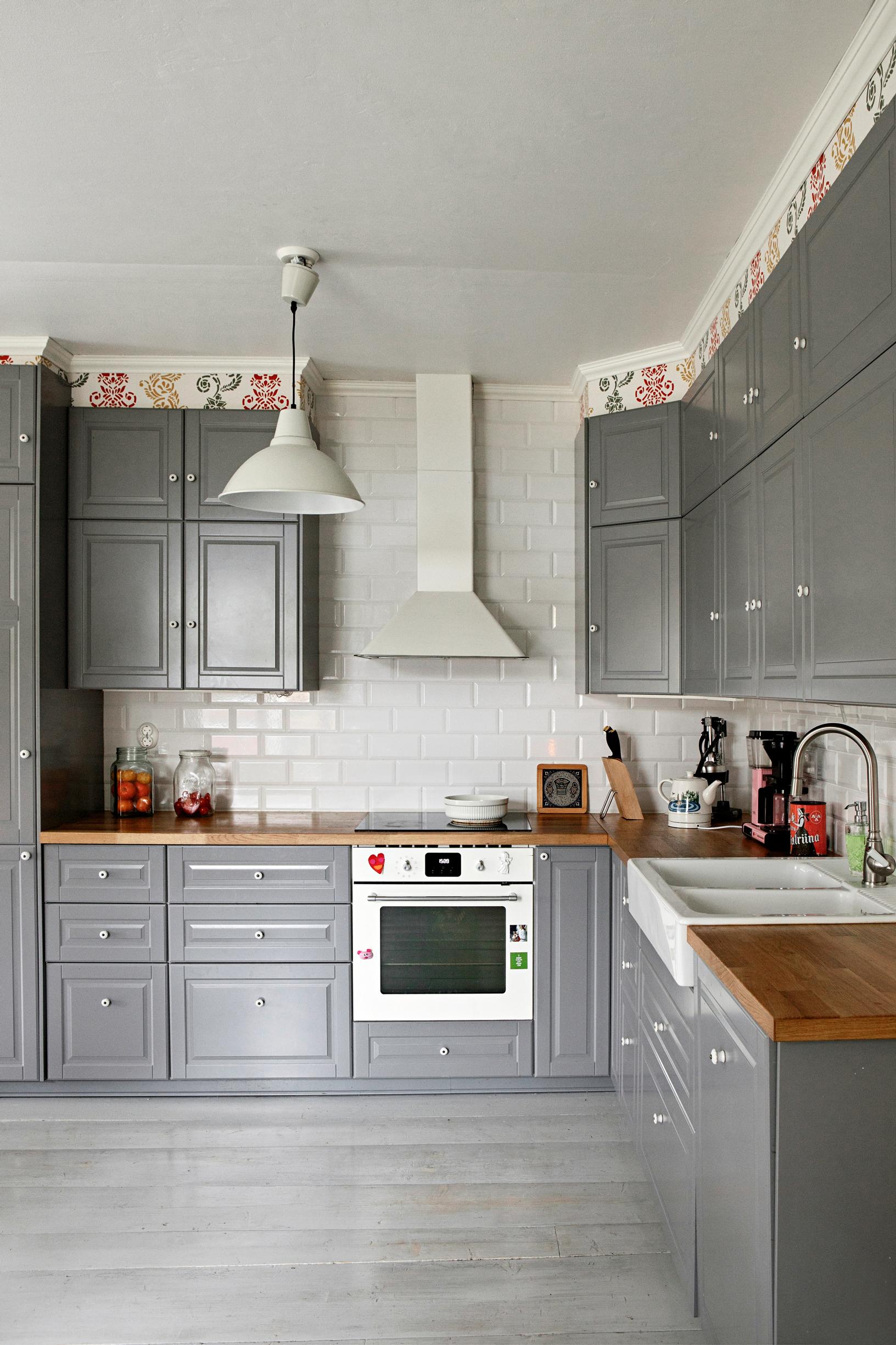 – Mietin pitkään, tuleeko tapetista liian hurja, mutta siitä tuli tosi hyvä. Näin sen vasta, kun tapetti oli seinässä. Ihmiset sanovat, että keittiöstä tulee hyvälle tuulelle, se on iloinen ja viihtyisä.