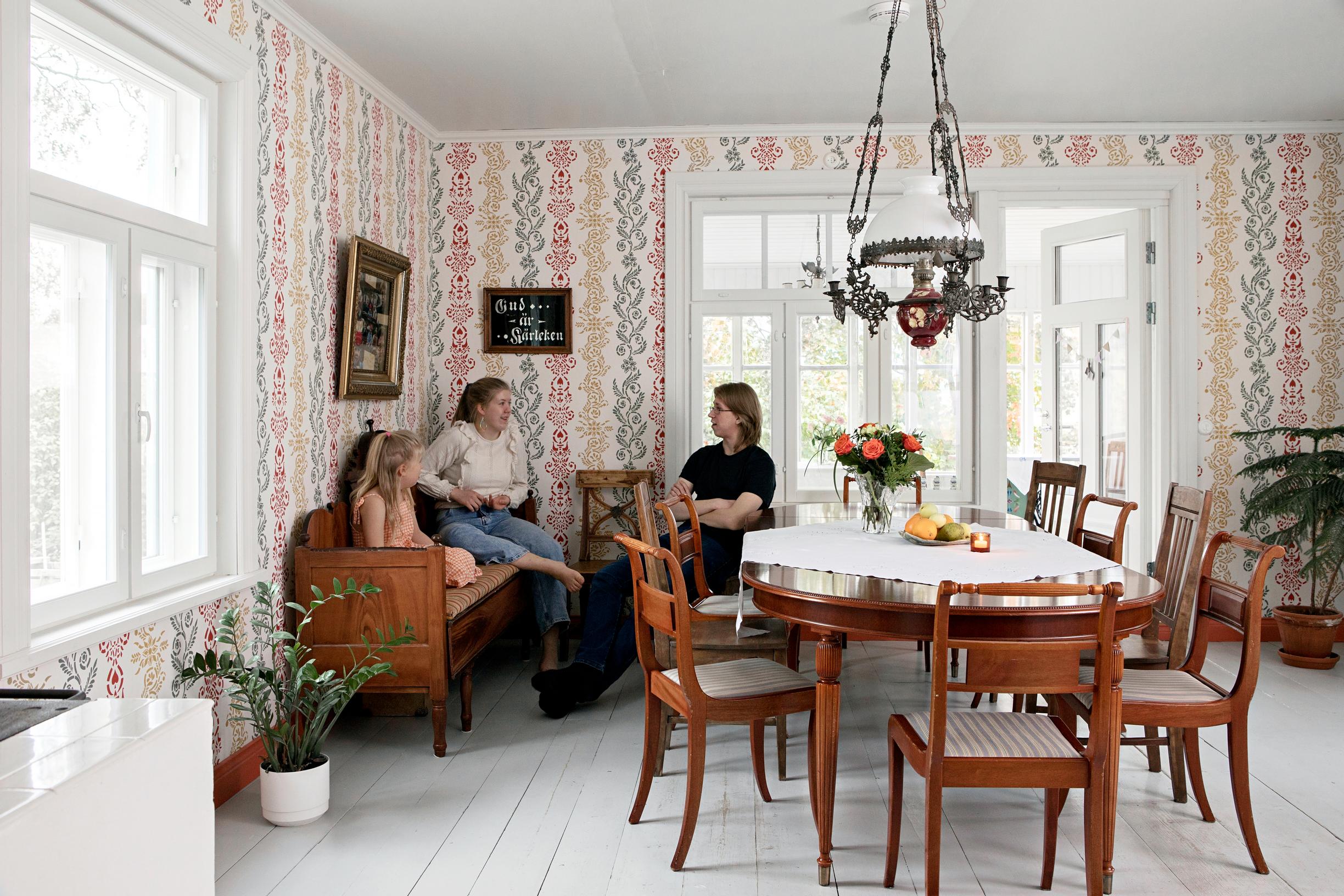 Mirjamin, 7, vuodetta suojaa vaaleanpunainen katos – moskiittoverkko, jonka Malin osti Tansaniasta. Kirjat on pinottu telineeseen, jossa on aiemmin kuivatettu leipiä. Tapetissa kiemurtelee vihreitä ornamenttityylisiä kuvioita. Ilme on huomattavasti hillitympi kuin viereisessä veljen huoneessa. Natanael, 17, oli halunnut punaiset tapetit, ja ne myös hankittiin, kukkakuvion kera. Hän nukkuu vanhassa antiikkisängyssä.