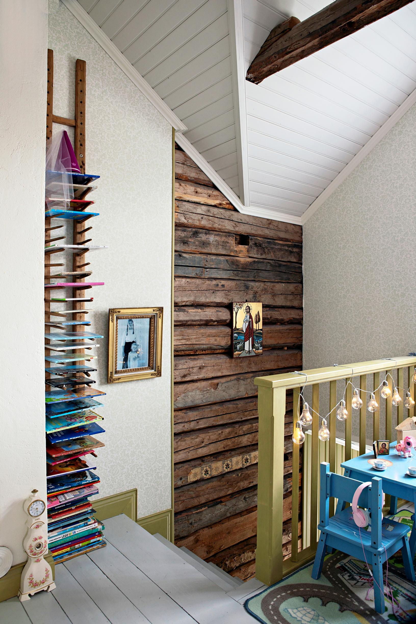 Kekseliäitä ratkaisuja on luvassa myös kuopuksen sopessa talon yläkerrassa, jonne kiivetään verhoamattoman hirsiseinän reunustamia rappusia pitkin. Portaikon yläpäässä huomio kiinnittyy ensin kattoon, jonka taidokas rakenne paljastui Malinille vasta remontin yhteydessä.