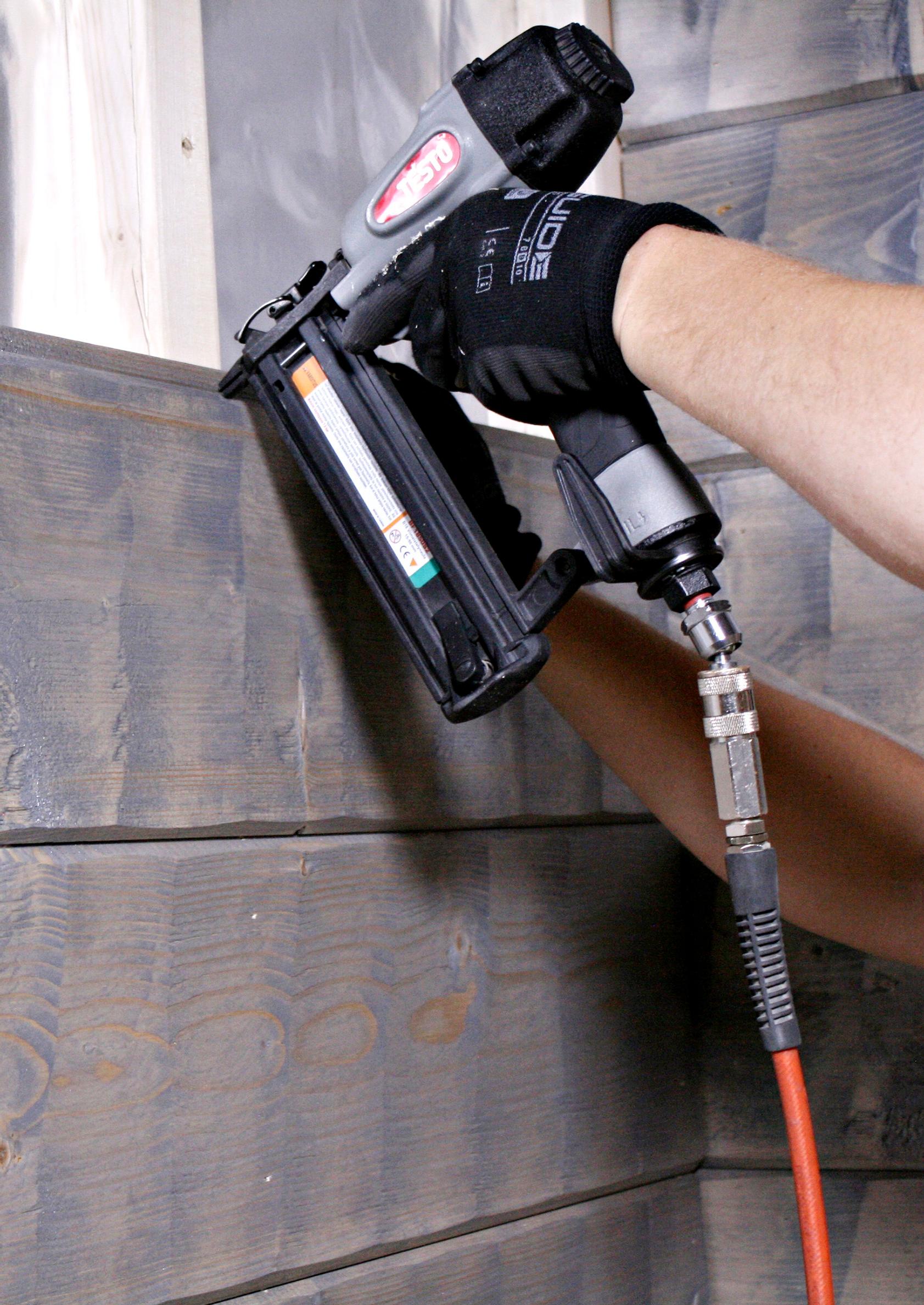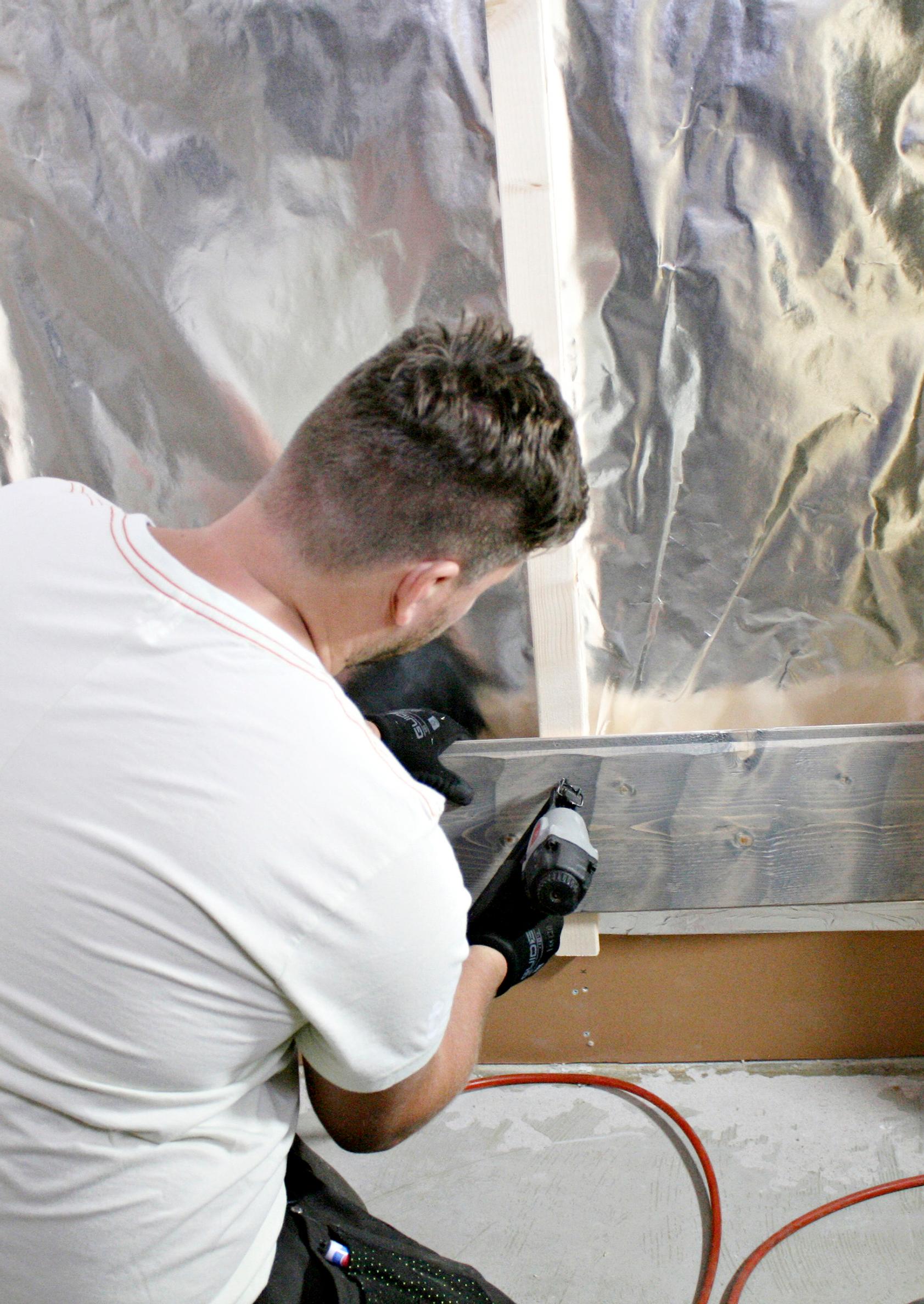 6. Asensimme saunapaneelit 6-senttisillä nauloilla urospontista piilokiinnityksellä. Koska paneeli oli niin järeä, ammuimme naulat myös paneelin läpi jokaiseen koolinkiin. Paneelit naulataan yleisesti aina pontista, mutta näin järeälle paneelille pelkkä piilokiinnitys olisi ollut liian heikko. Lisäksi naulat eivät pistä silmään piiluhirsipaneelin elävästä pinnasta.