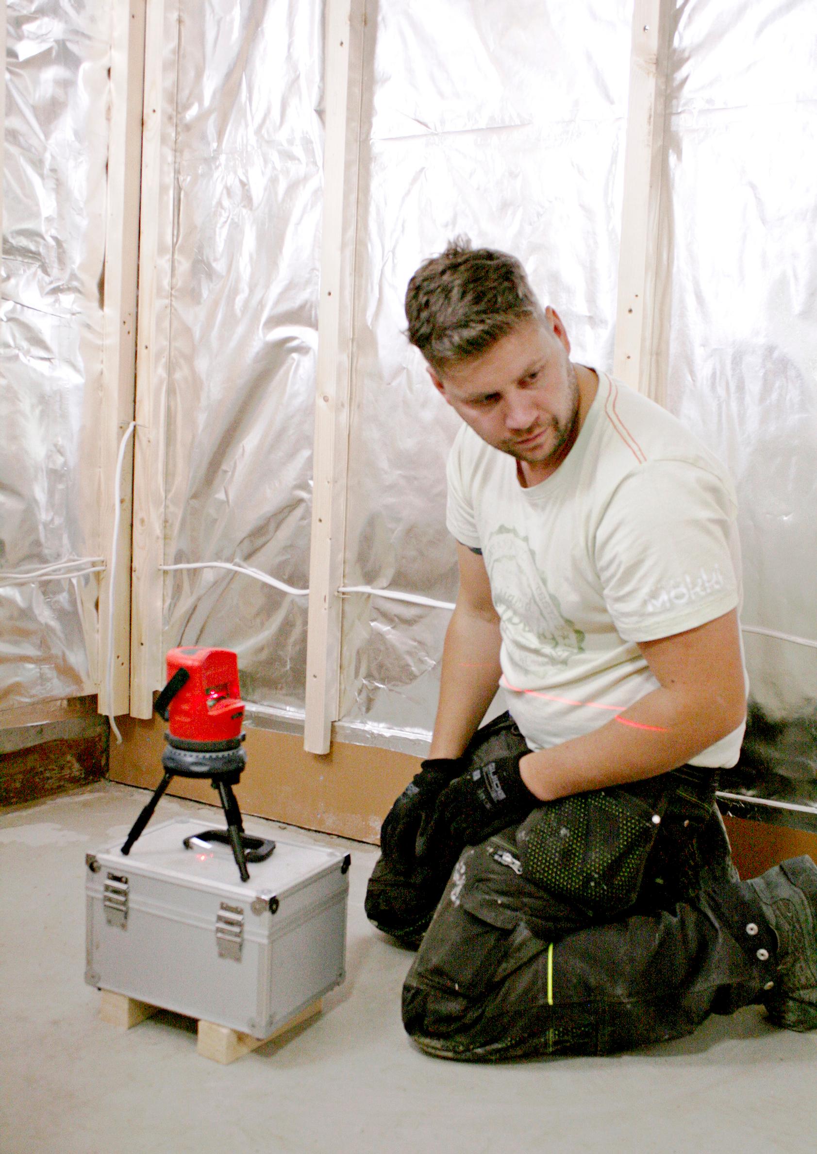 4. Paneelien pitää olla täsmälleen vaakasuorassa. Varmistimme asian laserilla, mutta sen voi tehdä myös vatupassilla. Koolausväli oli 60 senttiä.
