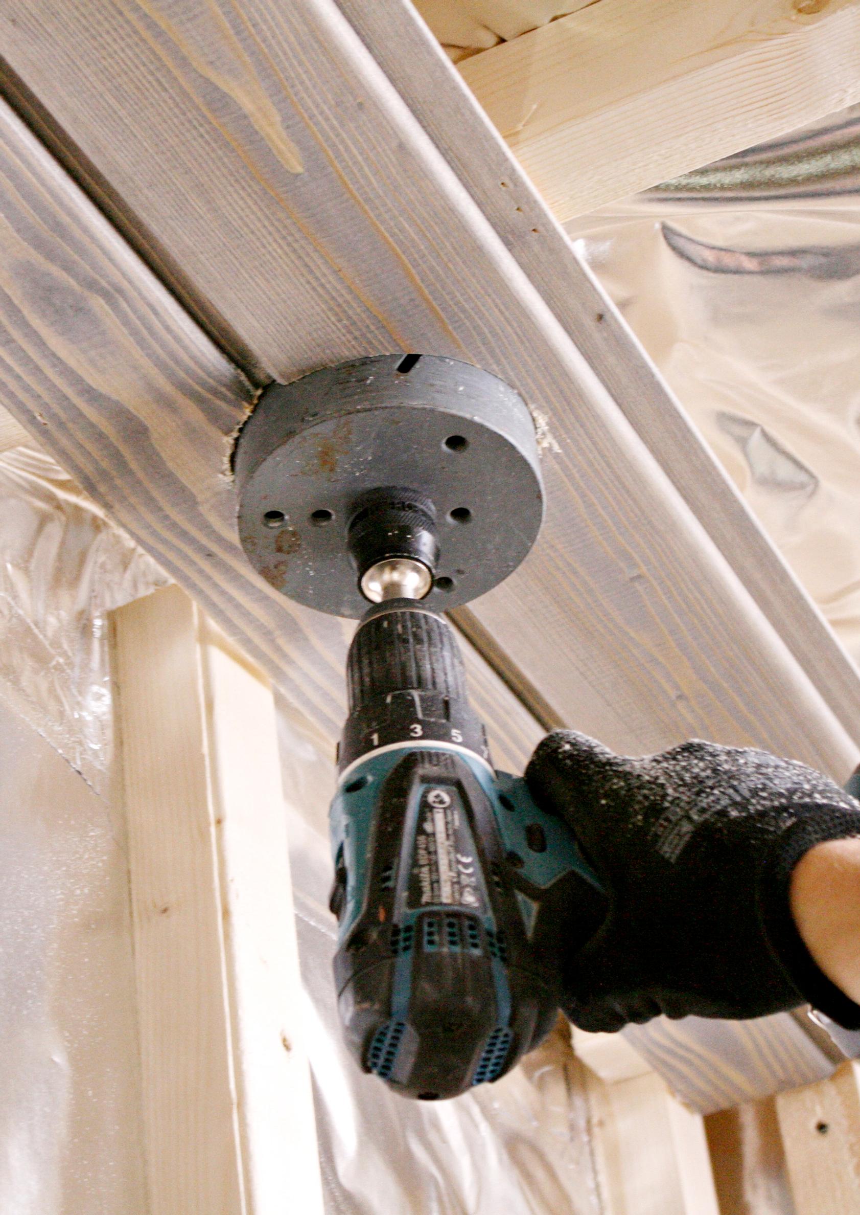 3. Mittasimme ilmanvaihtoventtiilin paikan. Näin saimme porattua kuppiterällä reiän tarkasti kohdalleen, josta asensimme läpiviennin suoraan ilmanvaihtoputken päähän.