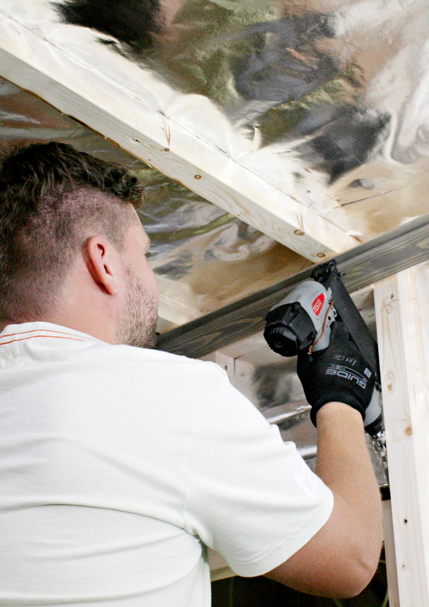 2. Aloitimme paneloinnin katosta, kun olimme ensin käsitelleet stp-paneelit kahteen kertaan. Mittasimme jaon ja jätimme molemmille reunoille yhtä leveät soirot.