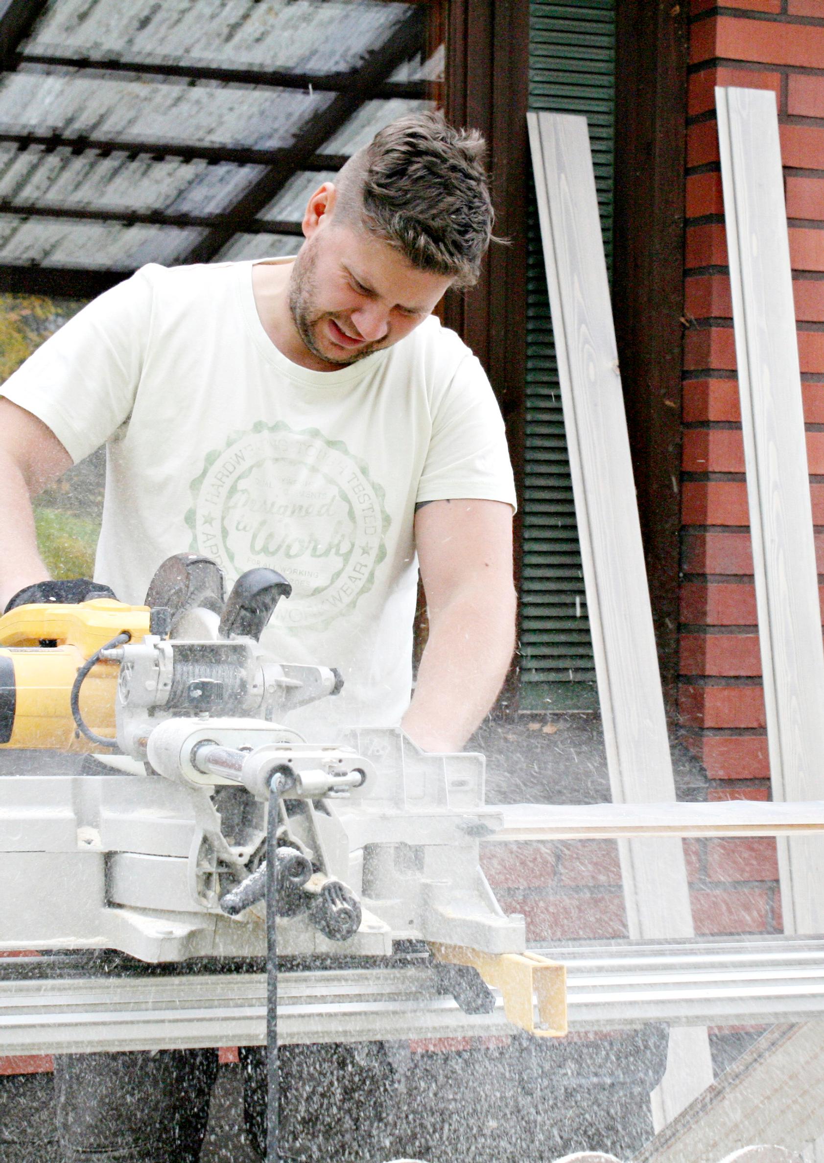 1. Työ aloitetaan sahaamalla paneelit mittaan. Tilasimme paneelit melkein määrämittaisina, joten meille riitti, kun lyhensimme lautoja hieman. Näin varmistimme myös sen, että lautojen päät tulevat varmasti siisteiksi.
