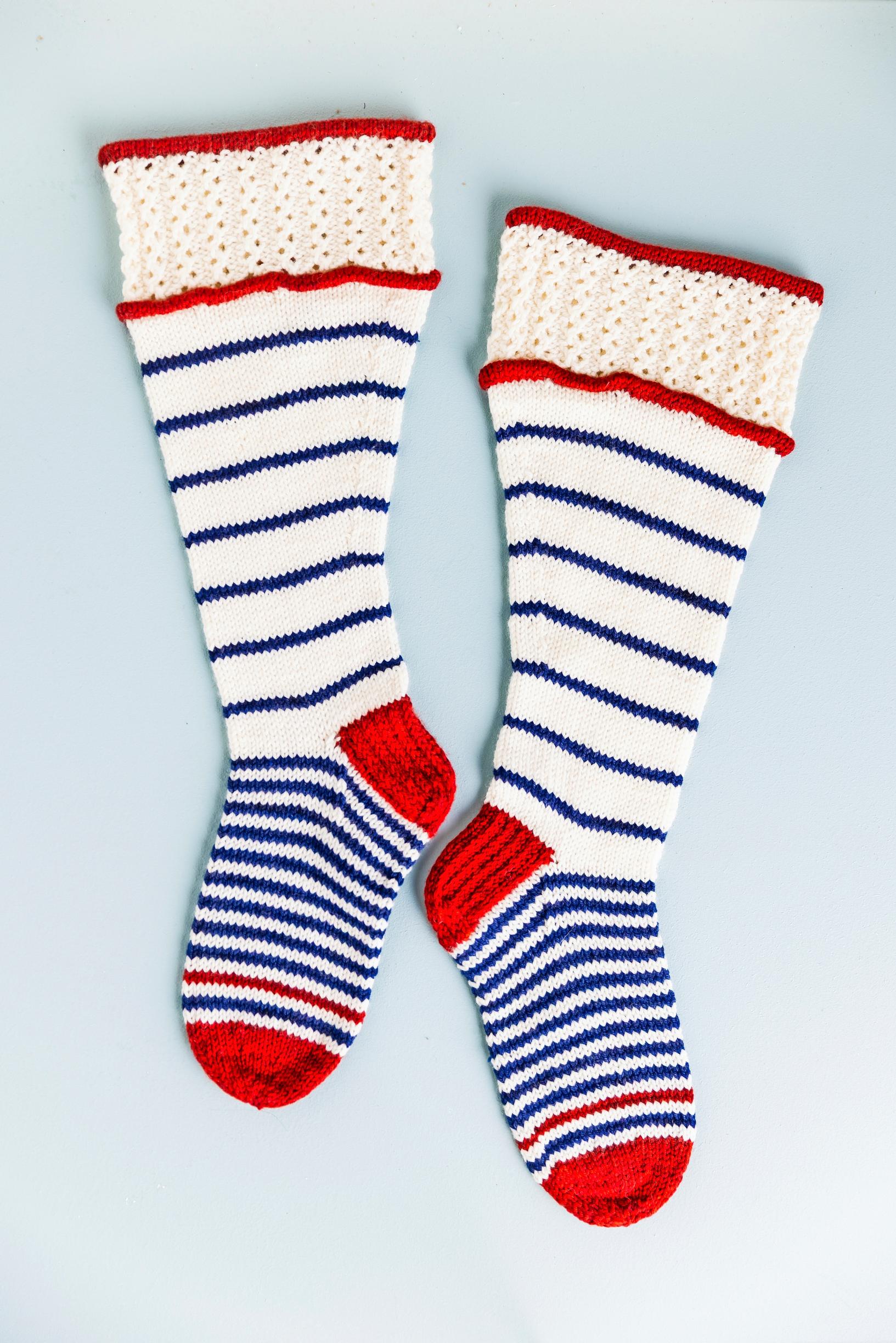 Merihenkiset raidat sekä sinisen, punaisen ja valkoisen yhdistelmä tekevät näistä sukista todellisen kesäsuosikin. Ohjeessa on koot 26–46, joten voit neuloa sukat vaikka koko perheelle.