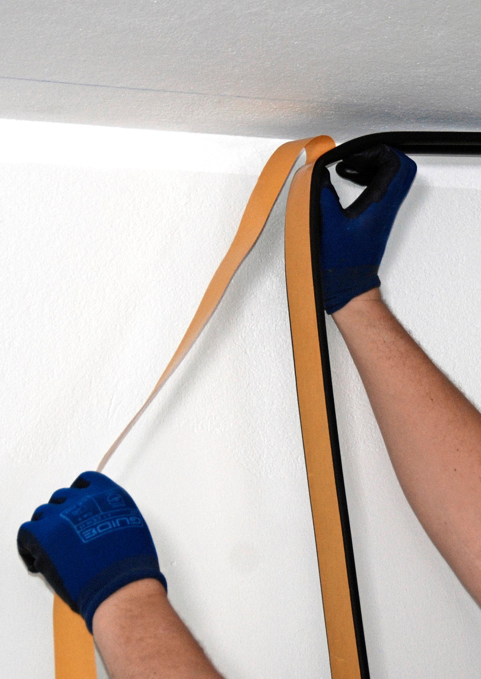 Jätä vanhan ja uuden seinärakenteen väliin noin sentin ilmarako. Mittaa seinärungon paikka ja merkitse se huolellisesti. Liimaa rungon alle jäävä tiivistenauha merkitsemällesi linjalle. Proppaa sitten teräsrankarunko kiinni kattoon ja lattiaan.