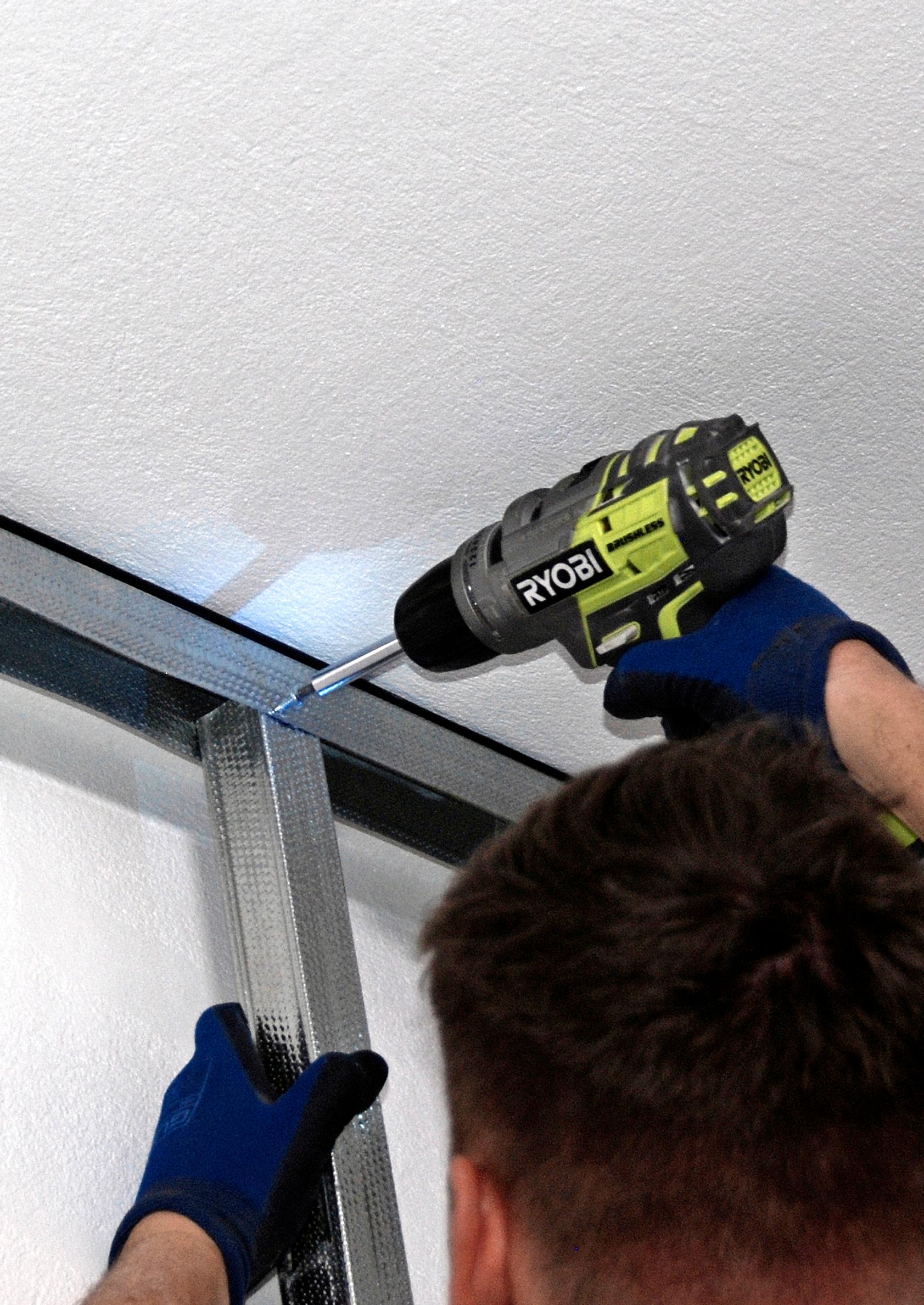 Nämä ääntä eristävät erikoiskipsilevyt asennetaan vaakaan. Saumanauhaa ei tarvita, jos kipsitasoite on samaa tuoteperhettä kuin levyt. Täytä välit pakkelilastalla levyn reunojen kanssa samaan tasoon.