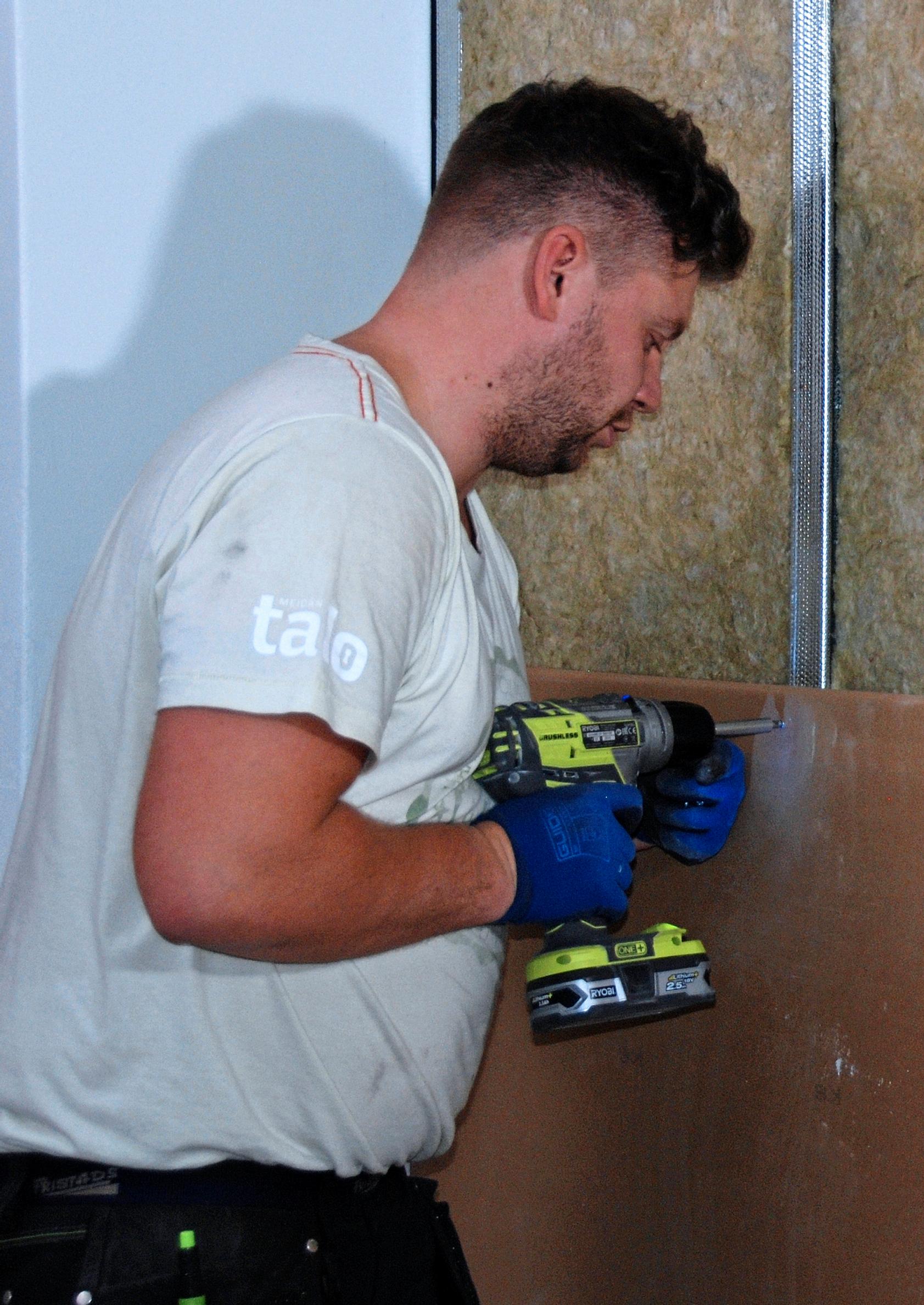 Asenna villalevyt tiiviisti runkotolppien väliin. Käytä esimerkiksi 50 mm:n vuorivillaa. Kun eristys on valmis, aloita levytys. Tavallista kipsilevyä kannattaa asentaa kaksi kerrosta, mutta tätä erikoistiivistä levyä riitti yksi. Jätä levy noin 5 milliä irti lattiasta.