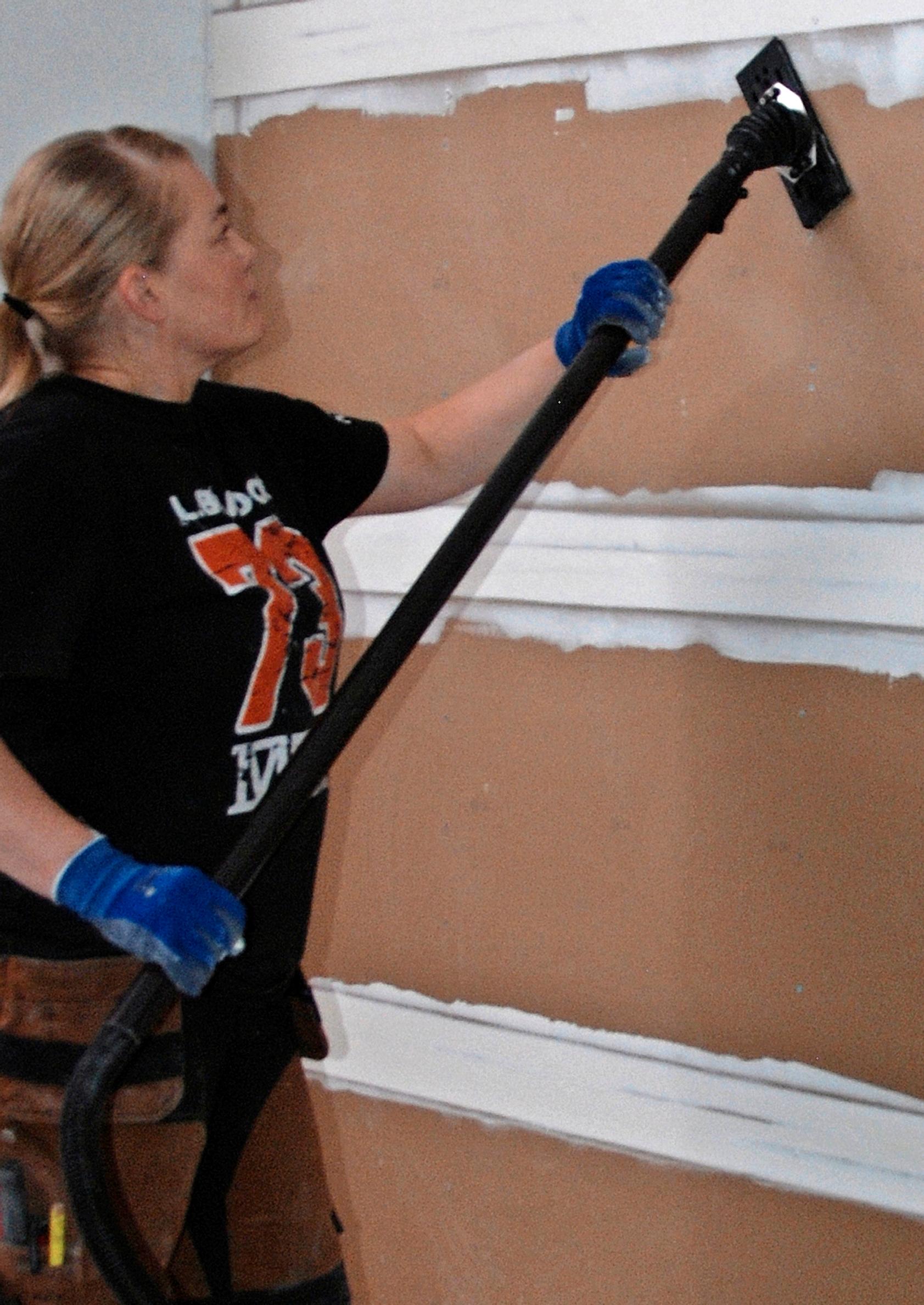 Kun saumojen kipsitasoite on kuivunut, hio seinä kauttaaltaan kevyesti. Käsittele huolellisesti etenkin purseet ja ruuvien kohdat. Tiivistä katon ja seinien puolelta elastisella massalla, kuten akryylimassalla. Imuroi seinä puhtaaksi pölystä.