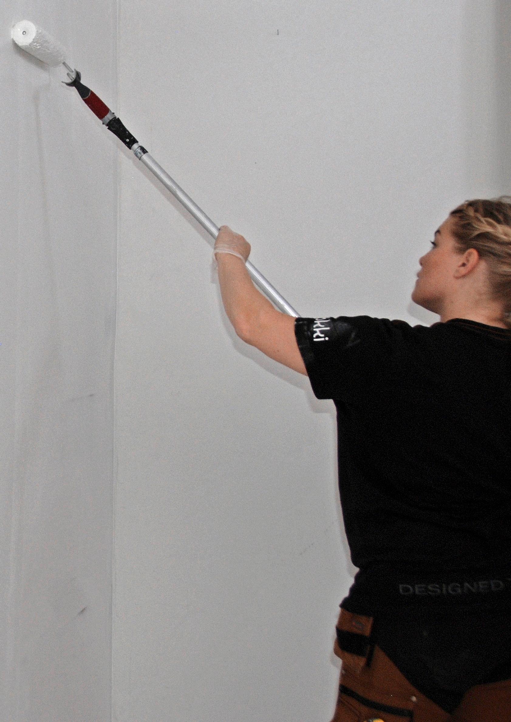 Pohjamaalaa seinä kauttaaltaan. Maalaa pensselillä seinän reunat, mutta telalla ja jatkovarrella selviät muusta nopeasti. Voit kitata kolot vielä pohjamaalauksen jälkeen, jos siihen on tarvetta. Telaa pintamaali kahteen kertaan, jotta seinästä tulee varmasti tasainen.