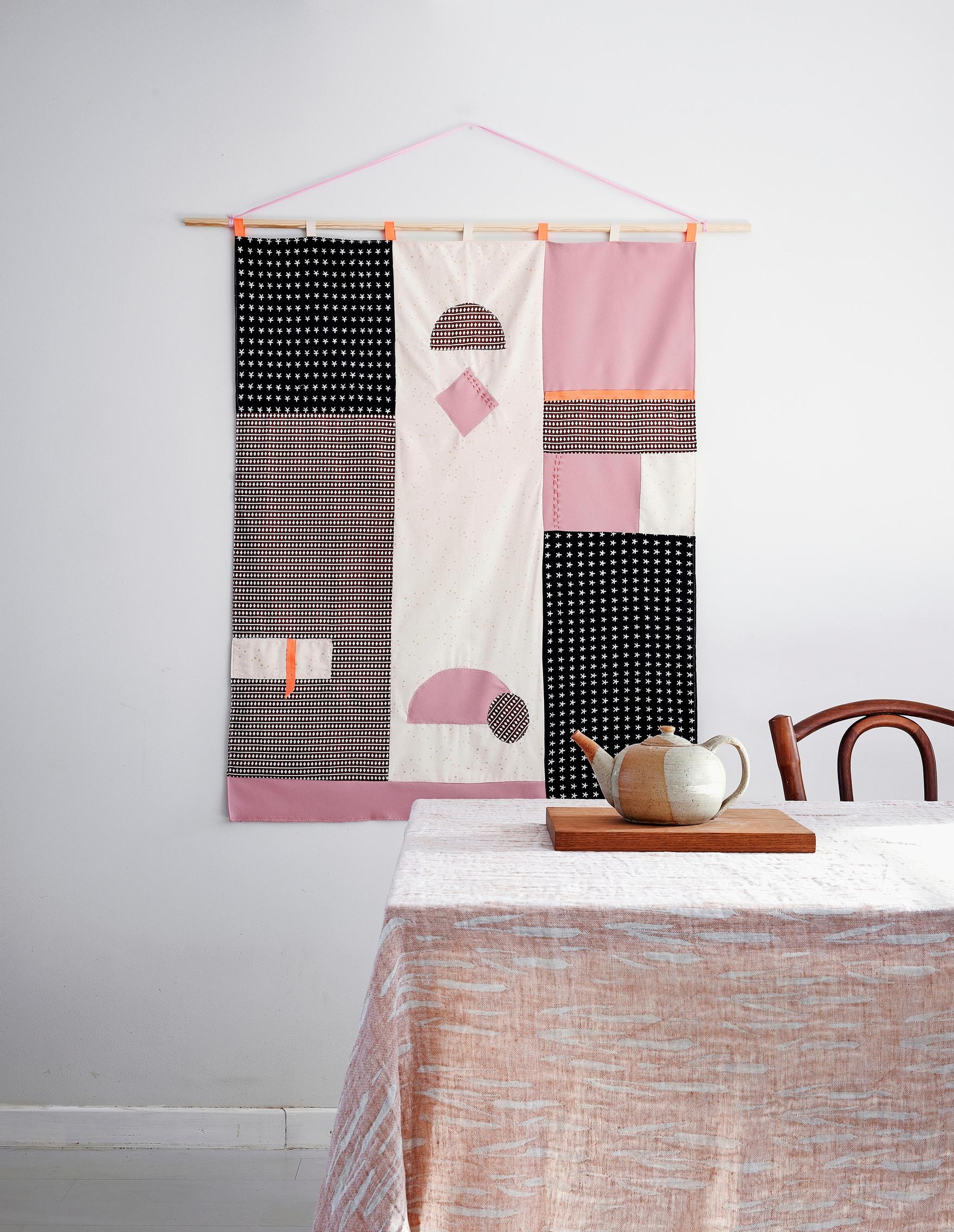 Tilkuista tehty seinävaate sopii kotiin, mökille tai lahjaksi. Kankaiden lisäksi tarvitset vain muutaman tunnin ja ompelutarvikkeet. Ripustus hoituu pyörökepillä ja nauhoilla.