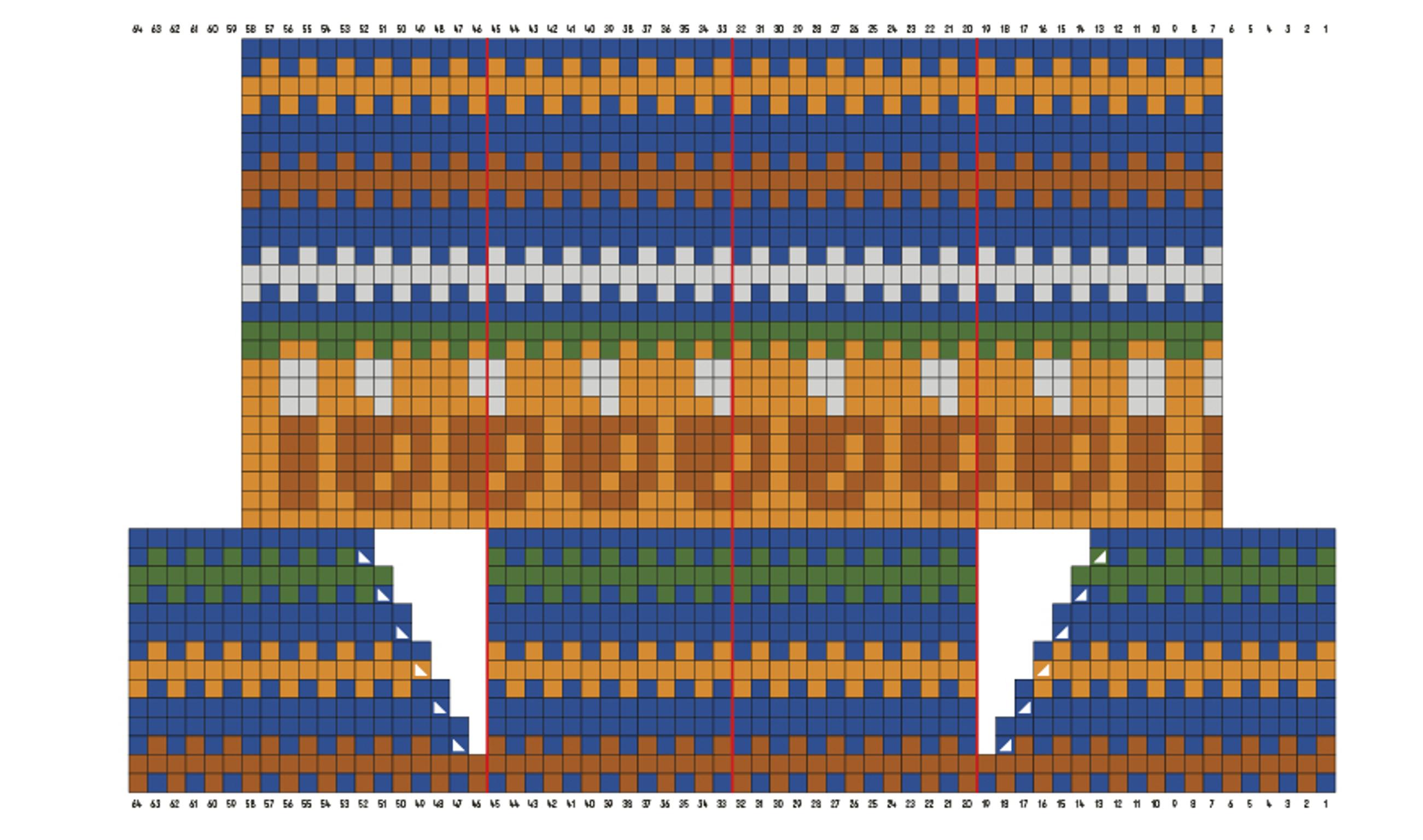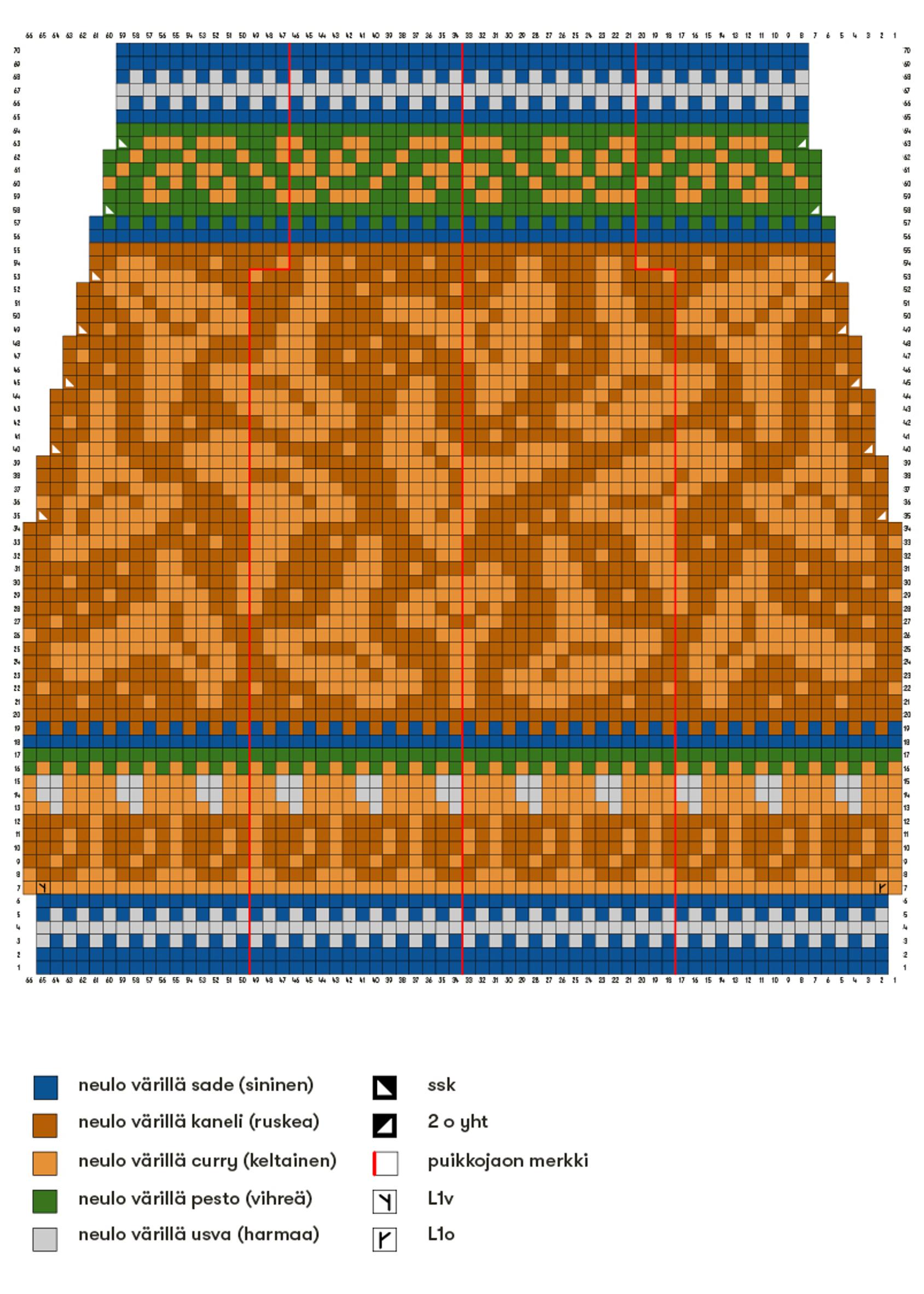 Neulo kaavio A. Lisää kaavion 7. krs:lla puikolle I ja puikolle IV 1 s = 66 s. Kavenna kerroksilla 35, 40, 45, 49, 53, 58 ja 63 krs:n alussa 2 o yht ja tee kerroksen lopussa ssk. Kerroksella 54 tasaa s:t puikoille 15/13/13/15. Kun olet neulonut kaavion 70. krs:n, työssä on 52 s (13/13/13/13).
