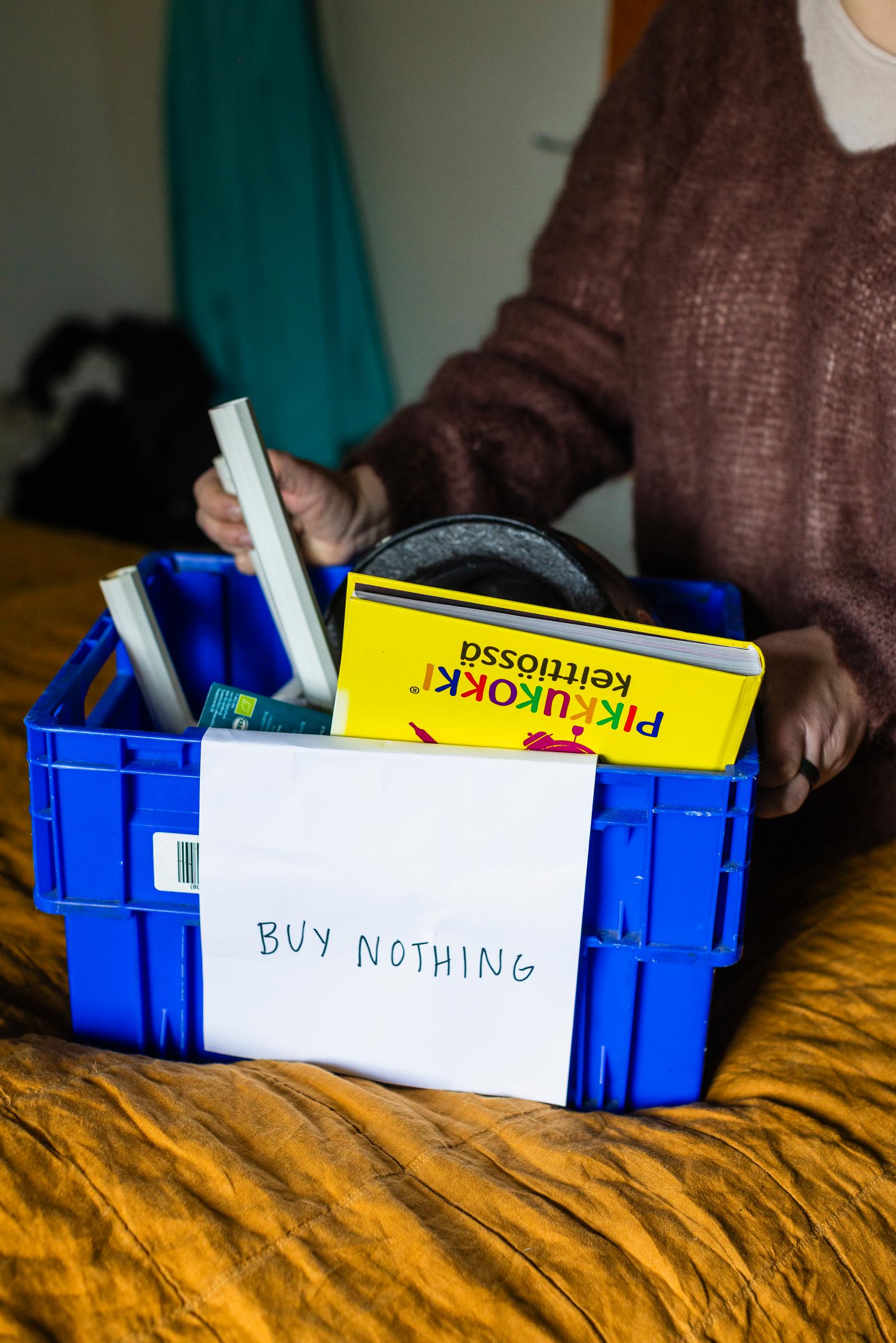 Taustalla on Buy Nothing- eli älä osta mitään -ryhmä, jonka Sirpa perusti uudelle kotialueelleen, kun muutti sinne Helsingin Haagasta viime kesänä. Ryhmä on osa kansainvälistä Buy Nothing Projectia, joka perustuu paikalliseen lahjatalouteen. Ryhmät hyväksyvät jäsenikseen vain tarkoin määritellyn alueen asukkaita. He voivat pyytää mitä tarvitsevat, lahjoittaa haluamaansa ja kiittää saamastaan. Samalla he tutustuvat naapureihin.