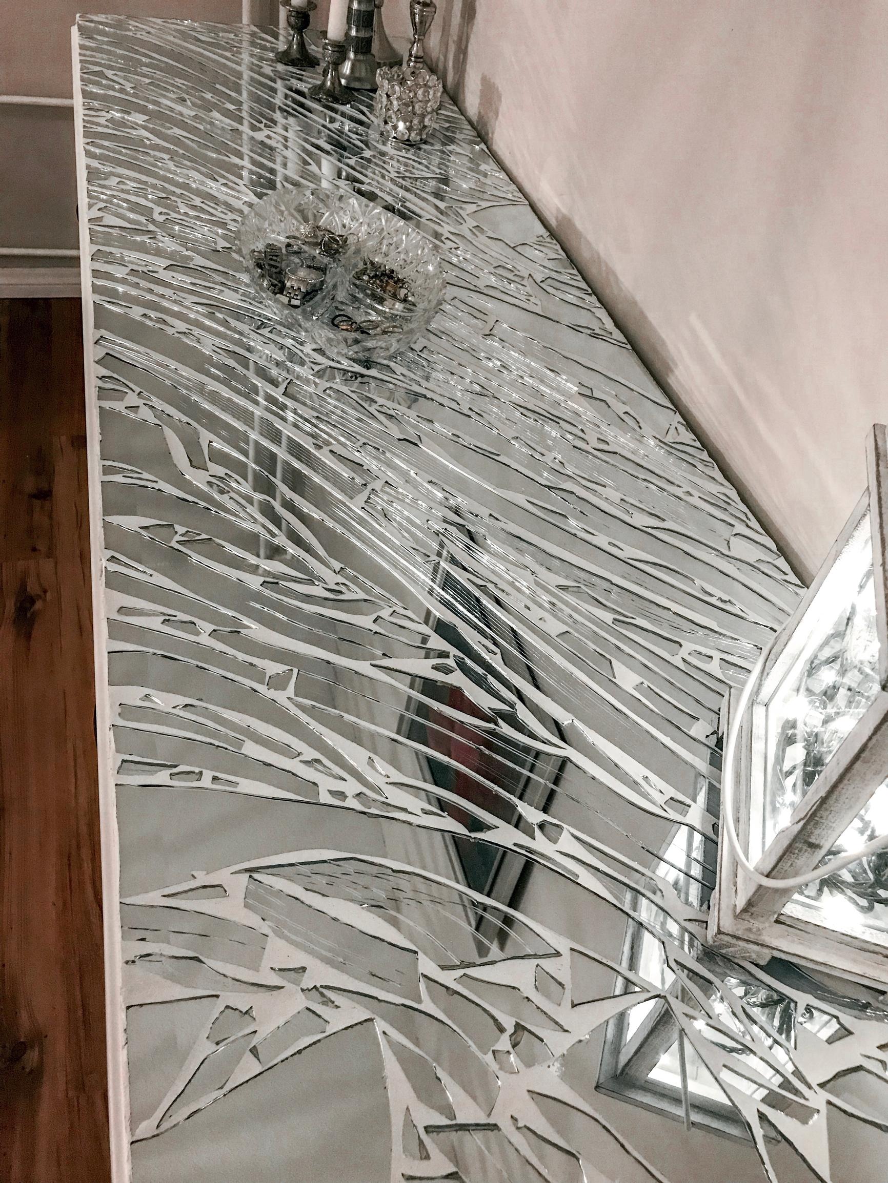 Päästin pari painokasta voimasanaa ja aloin kerätä sirpaleita ämpäriin, tarkoitus oli nakata palat roskikseen. Siinä sirpaleita noukkiessani mieleeni tuli, kuinka olin joskus visioinut peilinsirpaleiden liimaamista uudeksi pinnaksi. En kuitenkaan koskaan hennonut rikkoa ehjää peiliä. Nyt kissa oli kuitenkin tehnyt likaisen työn puolestani, ja minulla oli yhtäkkiä materiaali valmiina.
