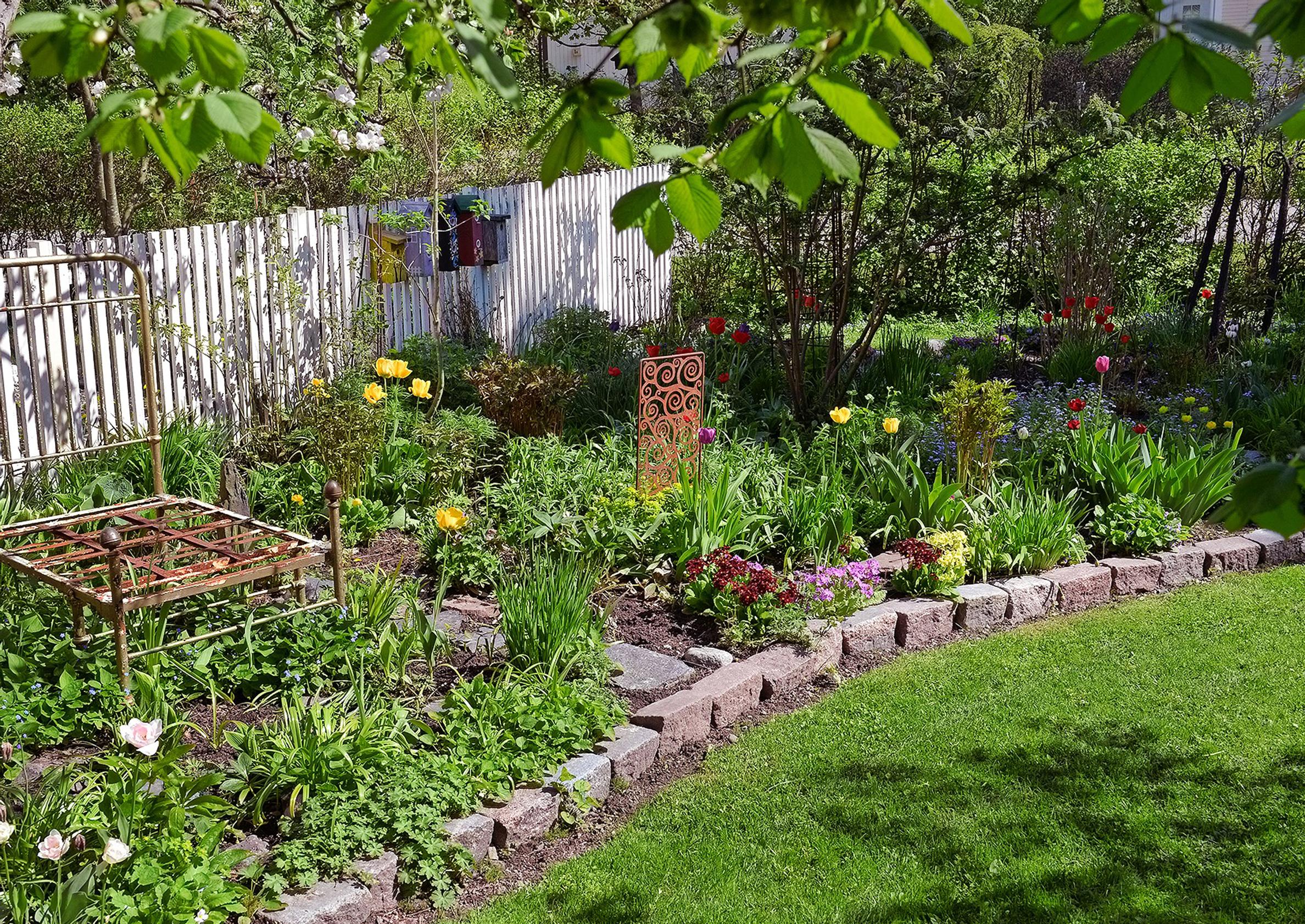 Monilajisuus, kastelu ja kompostimulta takaavat sen, että pihdan alusta säilyy Siskon puutarhassa lehtevänä keväästä syksyyn.
