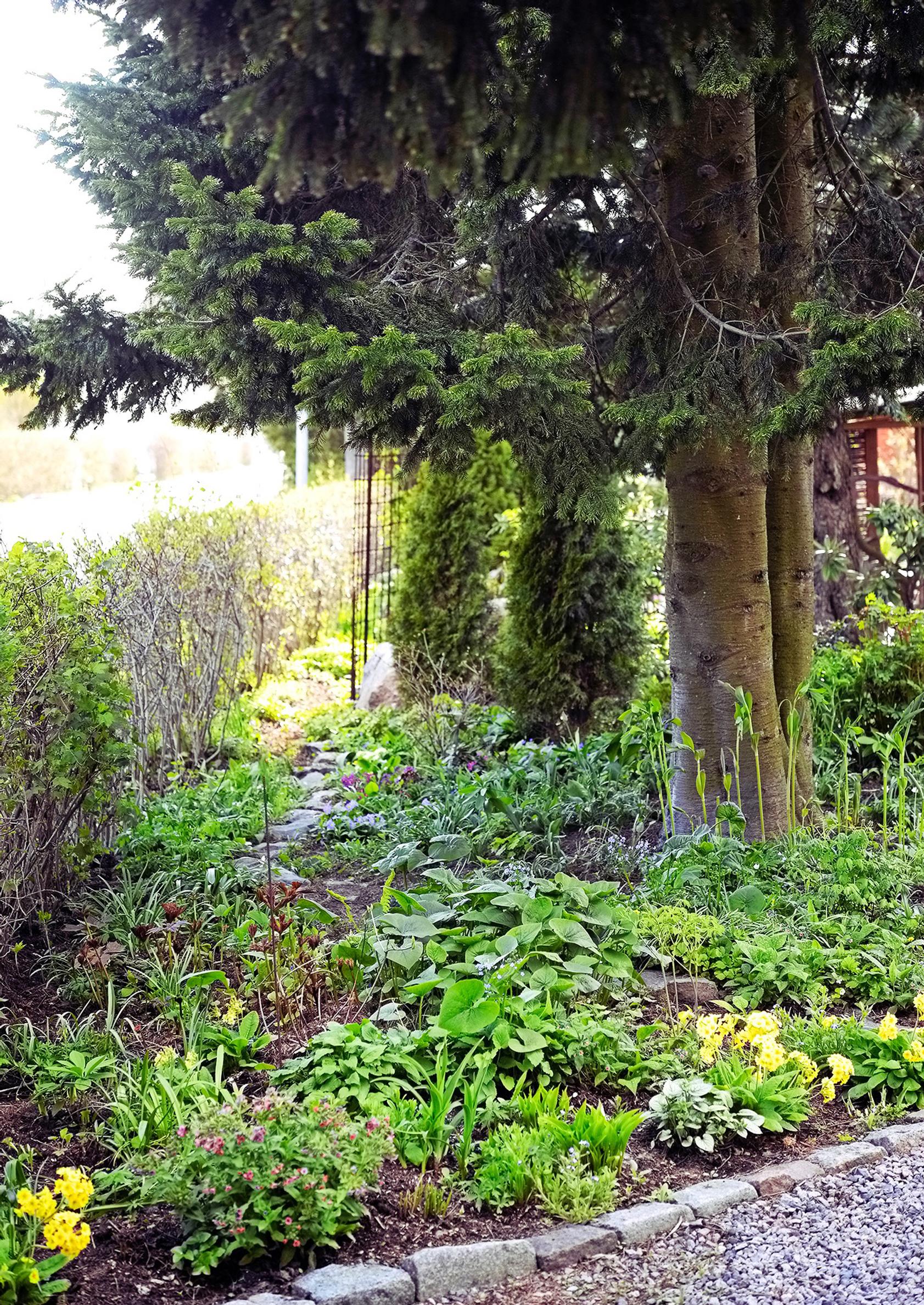 Ison kaksihaaraisen pihtakuusen alle Sisko on perustanut viehkeän varjotarhan. Nurkkaus on kuitenkin ollut pihan ongelmallisin paikka kasvittaa. Pihdan juuret suikertavat huopamaisena mattona maan pinnassa ja vievät kasvuvoimaa perennoilta. Lisäksi muutaman metrin päässä kasvaa muhkealatvuksinen sembramänty.