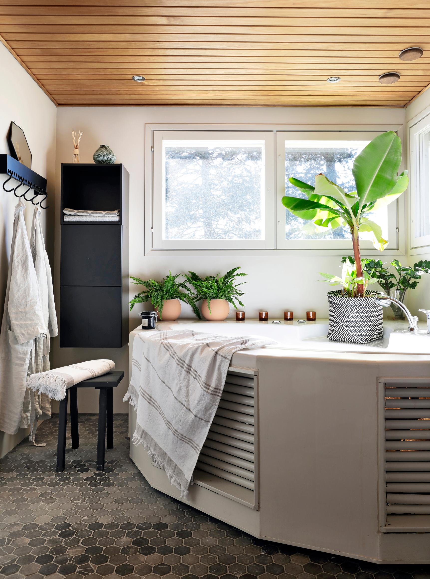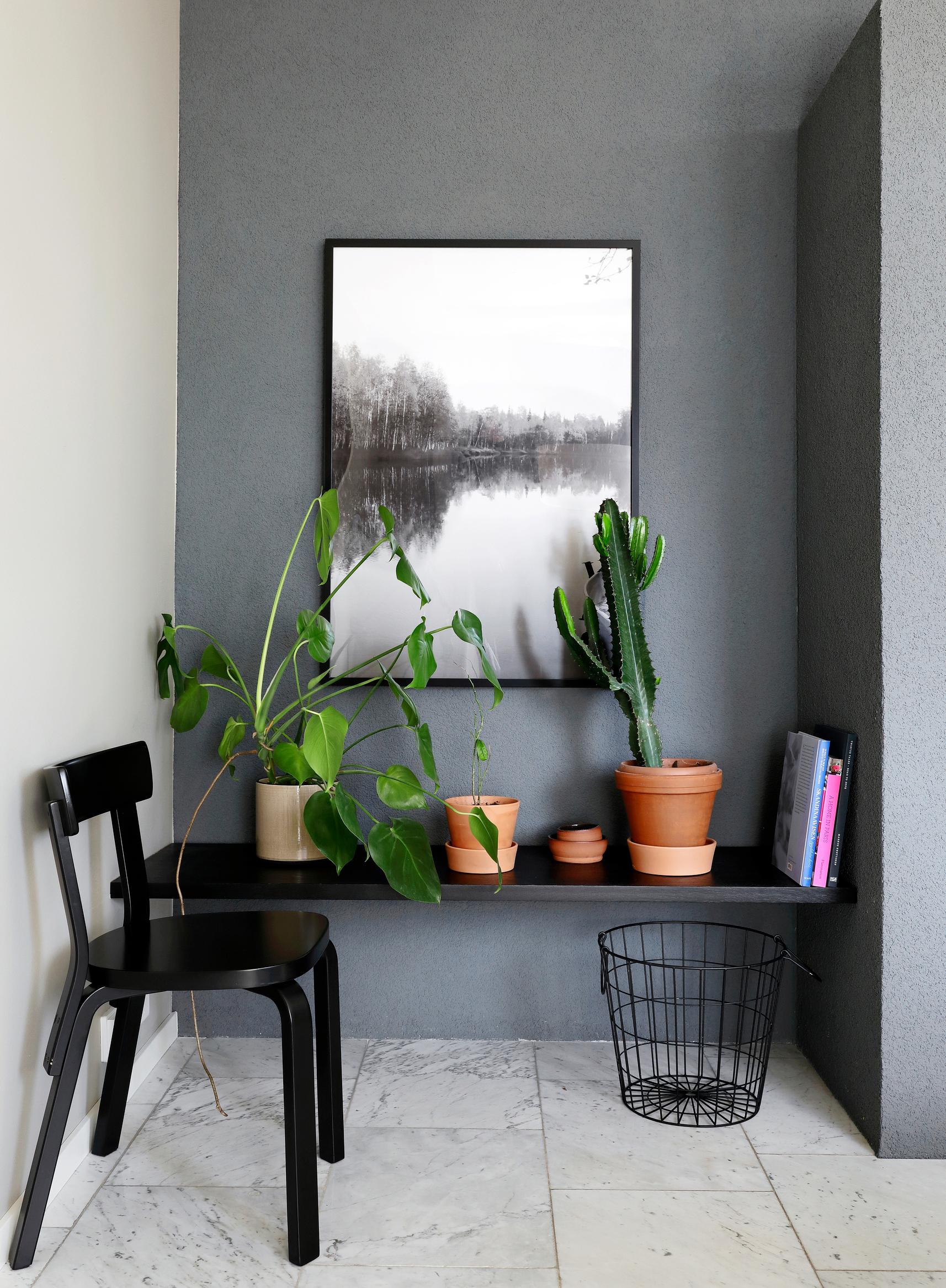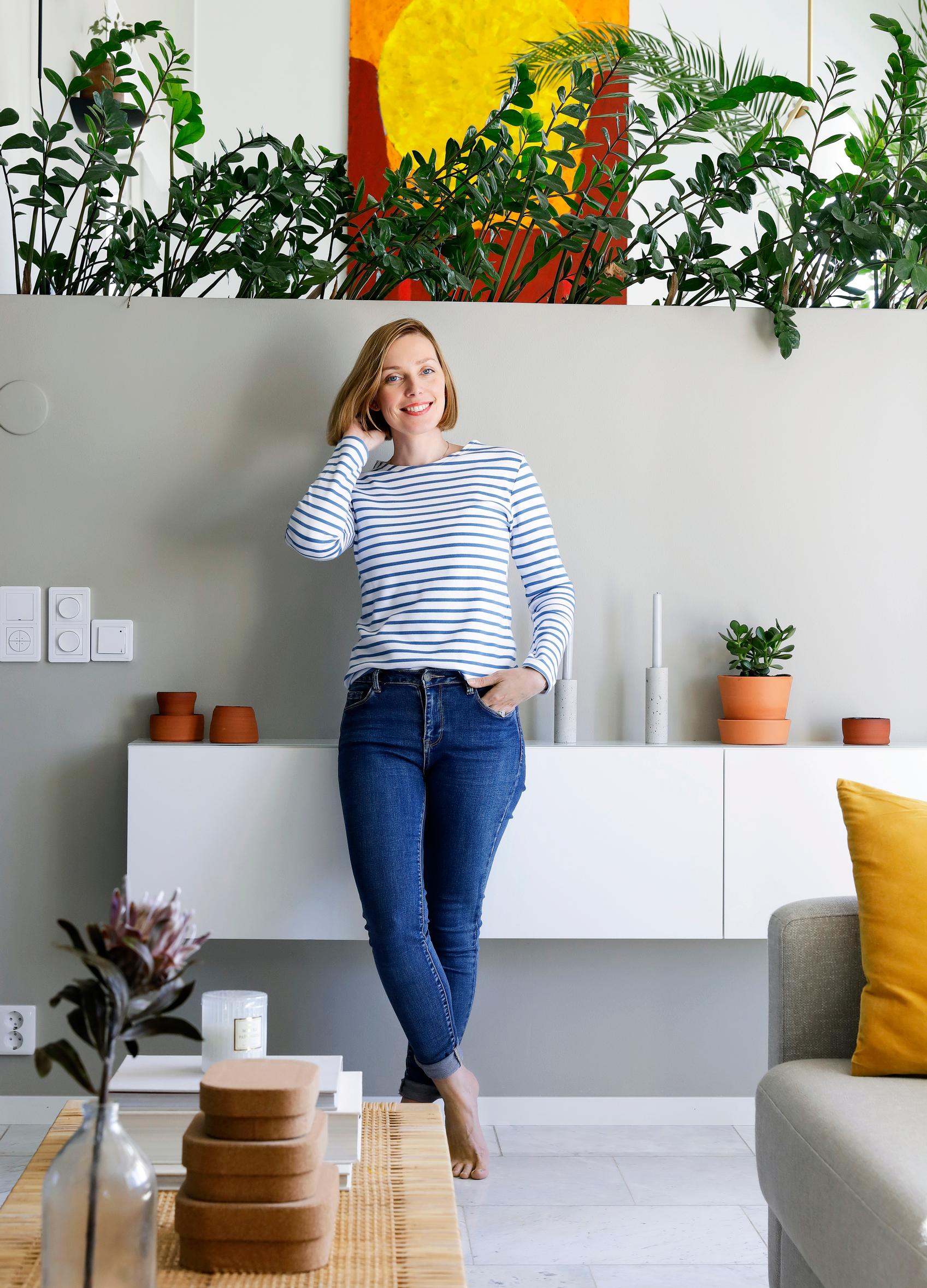 Kodin kaikissa tiloissa on runsaasti viherkasveja, sillä niillä saa helposti uutta ilmettä kotiin. Kasvit ovat sisustuselementtejä, mutta samalla hyödyllisiä puhdistaessaan huoneilmaa. Pelkistettyyn sisustukseen ne tuovat myös runsautta ja mielenkiintoa.