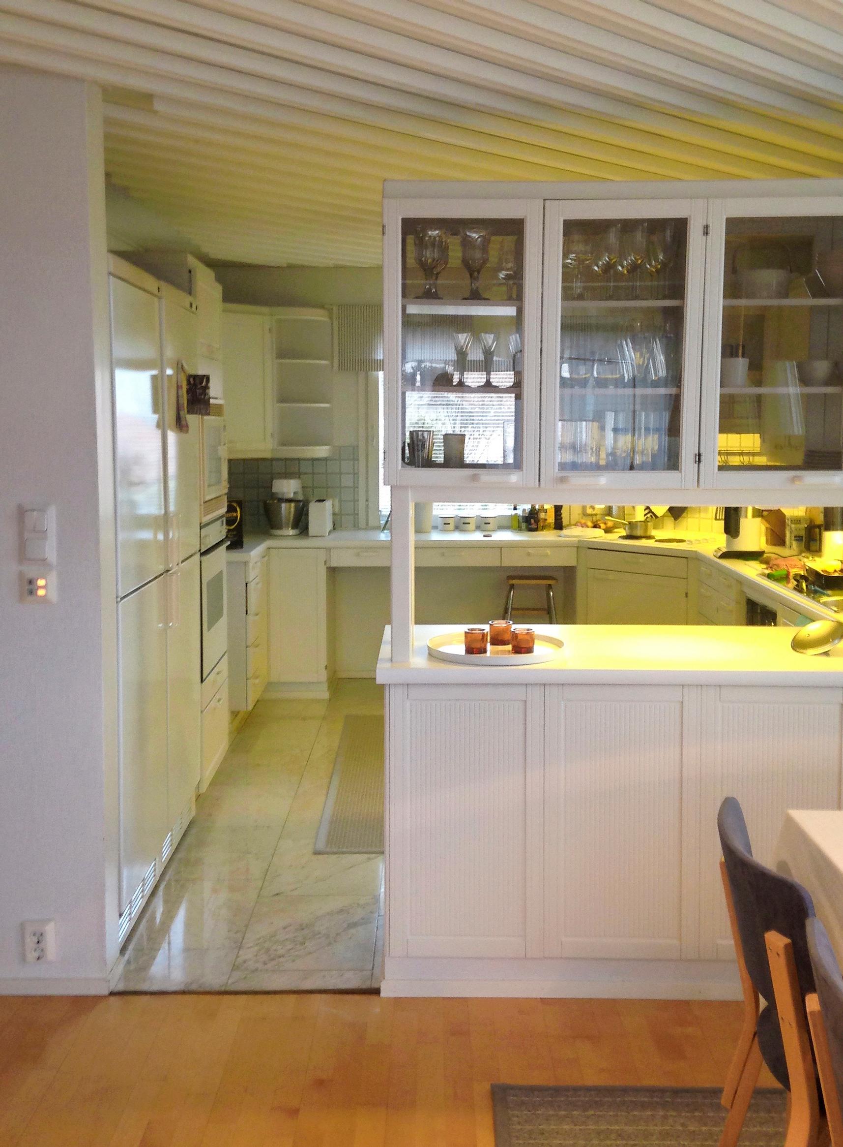 Keittiön välitilassa oleva ikkuna aiheutti päänvaivaa, koska 90 senttimetriä korkea laatikosto piti saada mahtumaan sen alle. Pulma ratkaistiin madaltamalla koko keittiön lattiapintaa. Se on nyt hieman alempana kuin ruokailutilan parkettilattia.