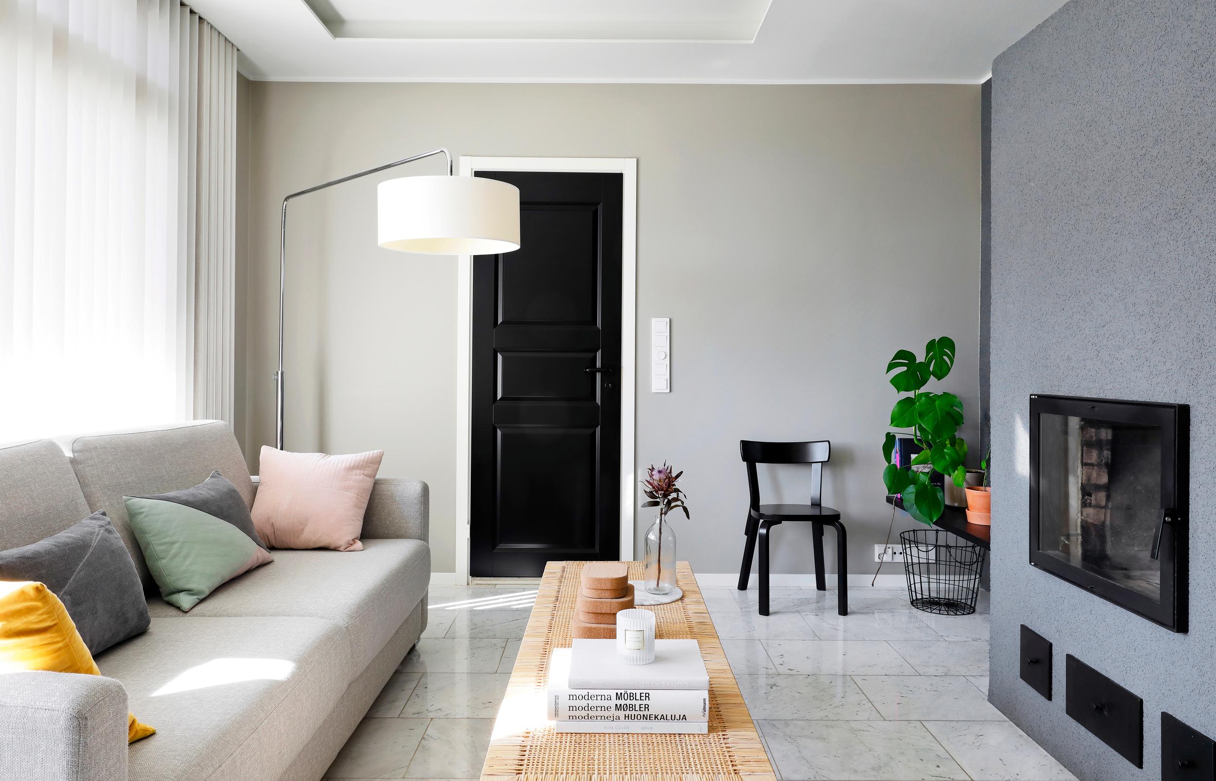 Kaikki kodin tilat uusittiin kerralla, jolloin pystyttiin vaikuttamaan kokonaisuuteen. Ainoa materiaali, joka haluttiin jättää ennalleen, oli alakerran marmorilattia ja joitakin vuosia aiemmin uusittu sauna.