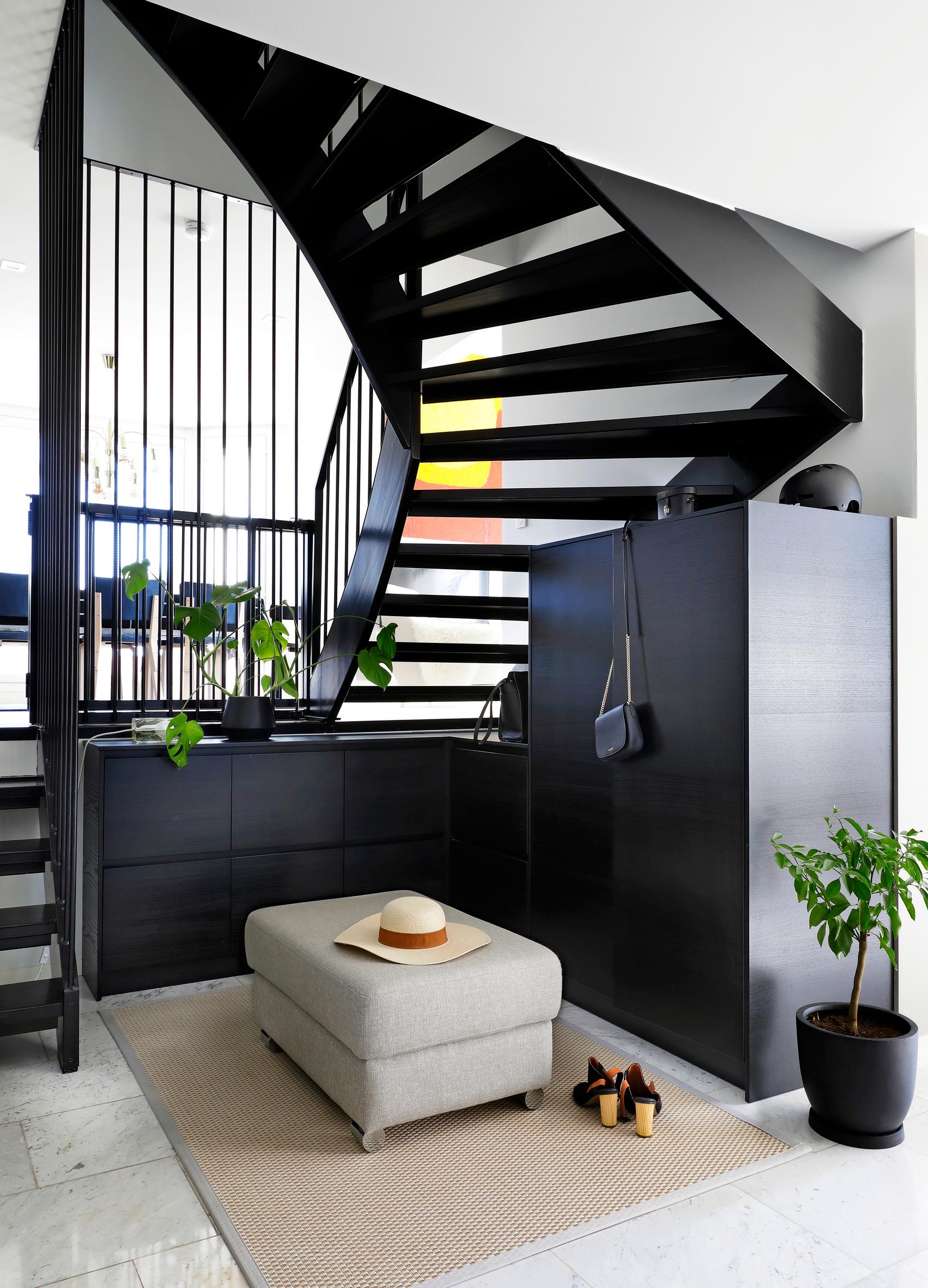 Taloa halkovat mustat portaat ja pinnakaiteet määrittelivät paljon koko talon sisustusratkaisuja.