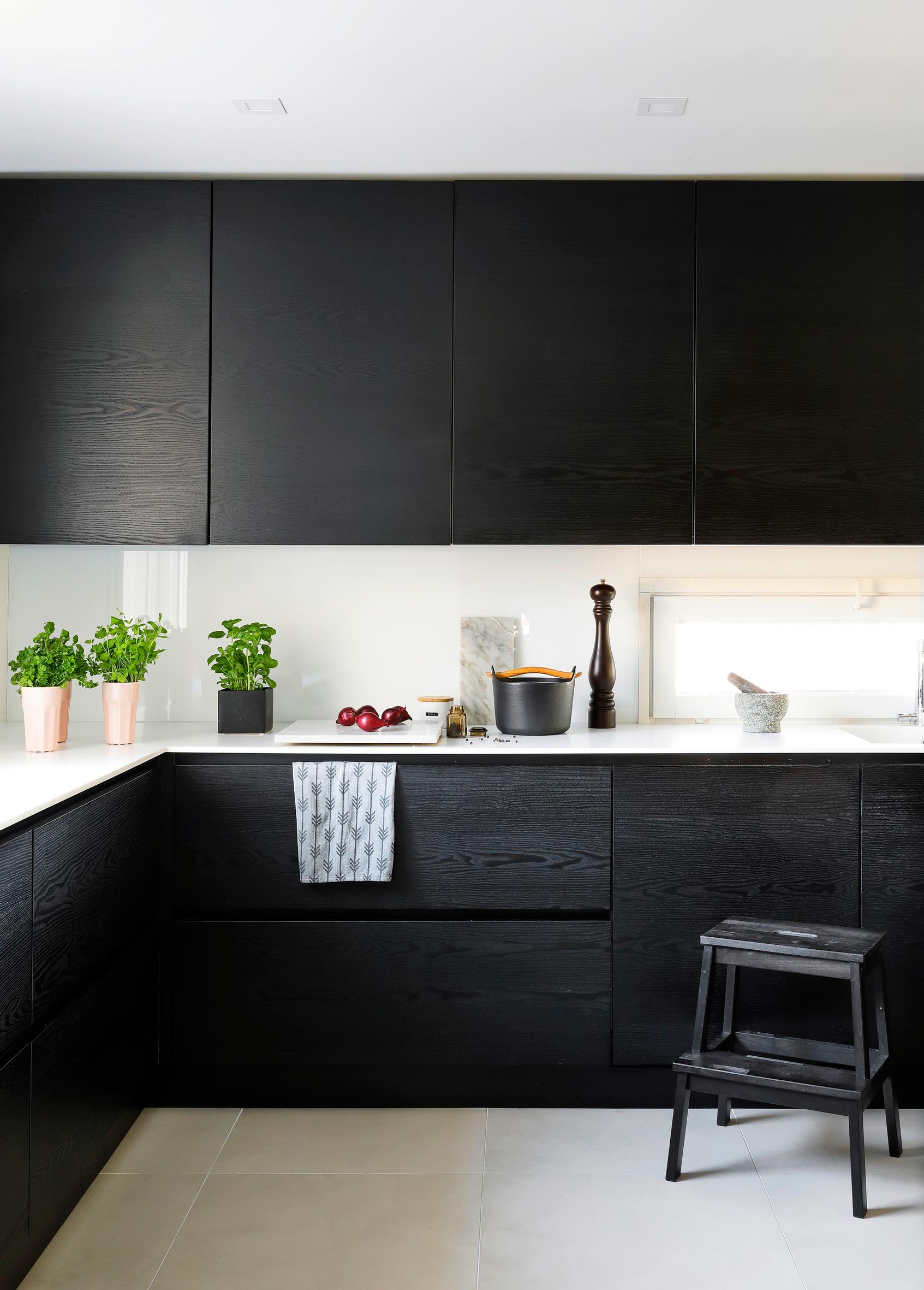 Keittiön mittojen mukaan teetetyt saarniovet petsattiin mustaksi mustan portaikon jatkoksi. Jussi ei ollut aluksi lainkaan vakuuttunut värivalinnasta, mutta kun hän näki ensimmäisen luonnoksen keittiöstä, hänkin innostui tummasta keittiöstä. Maija puolestaan antoi periksi valkoisen komposiittitason kanssa.