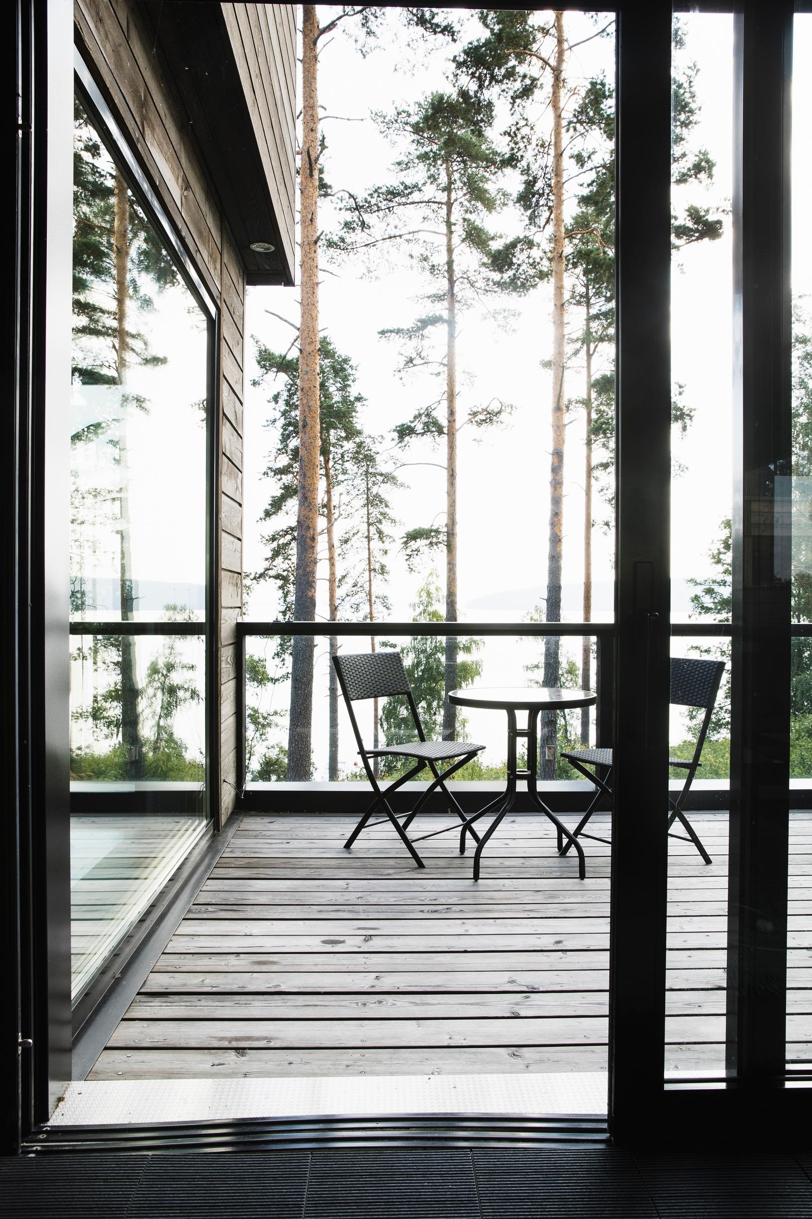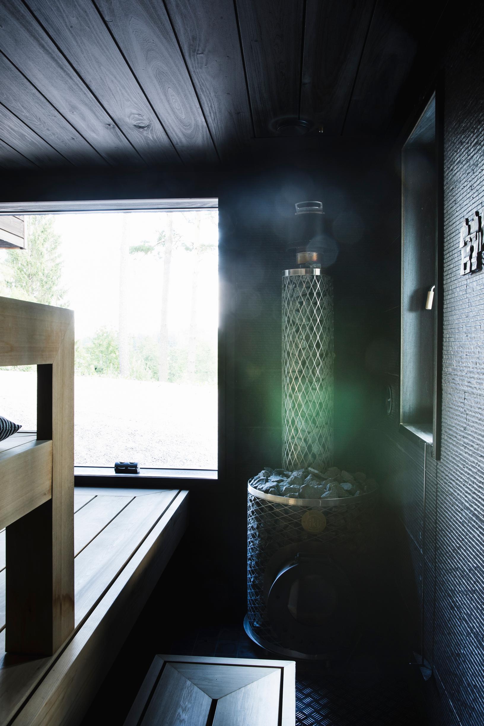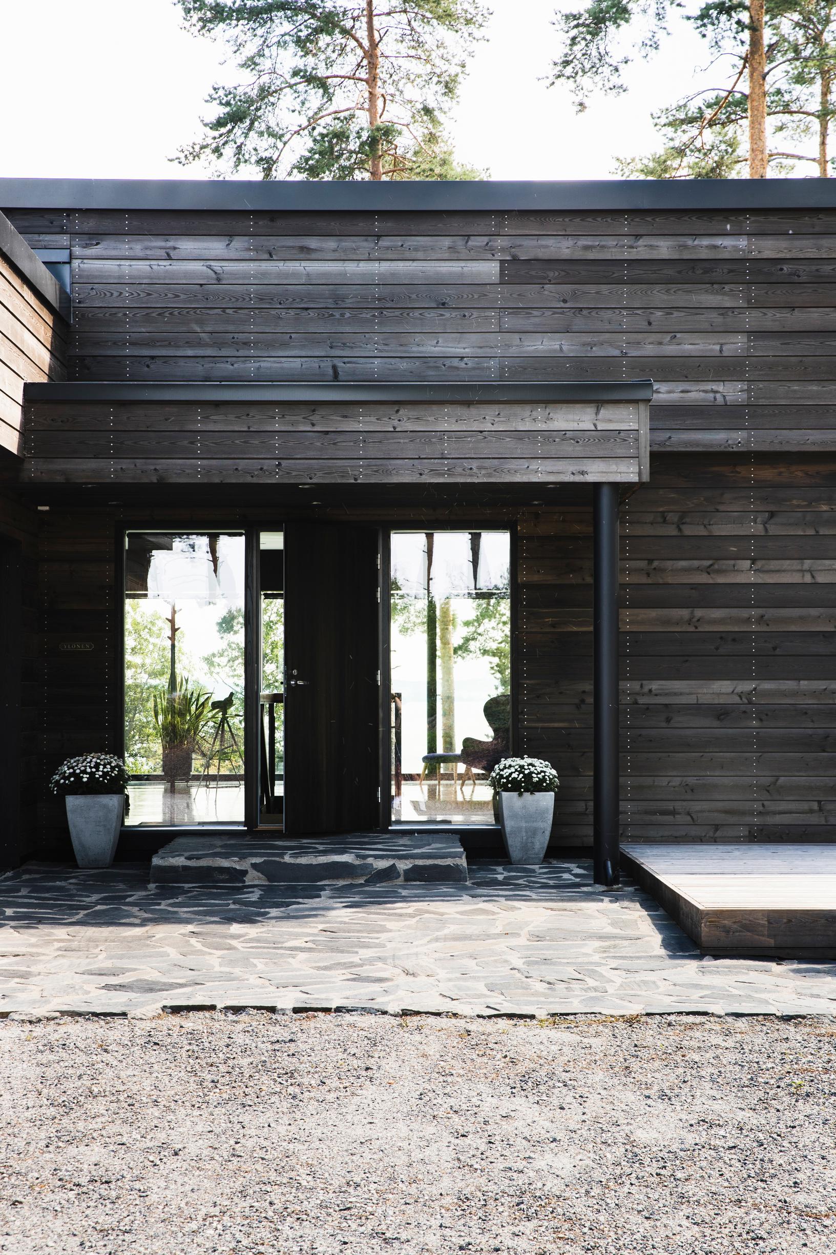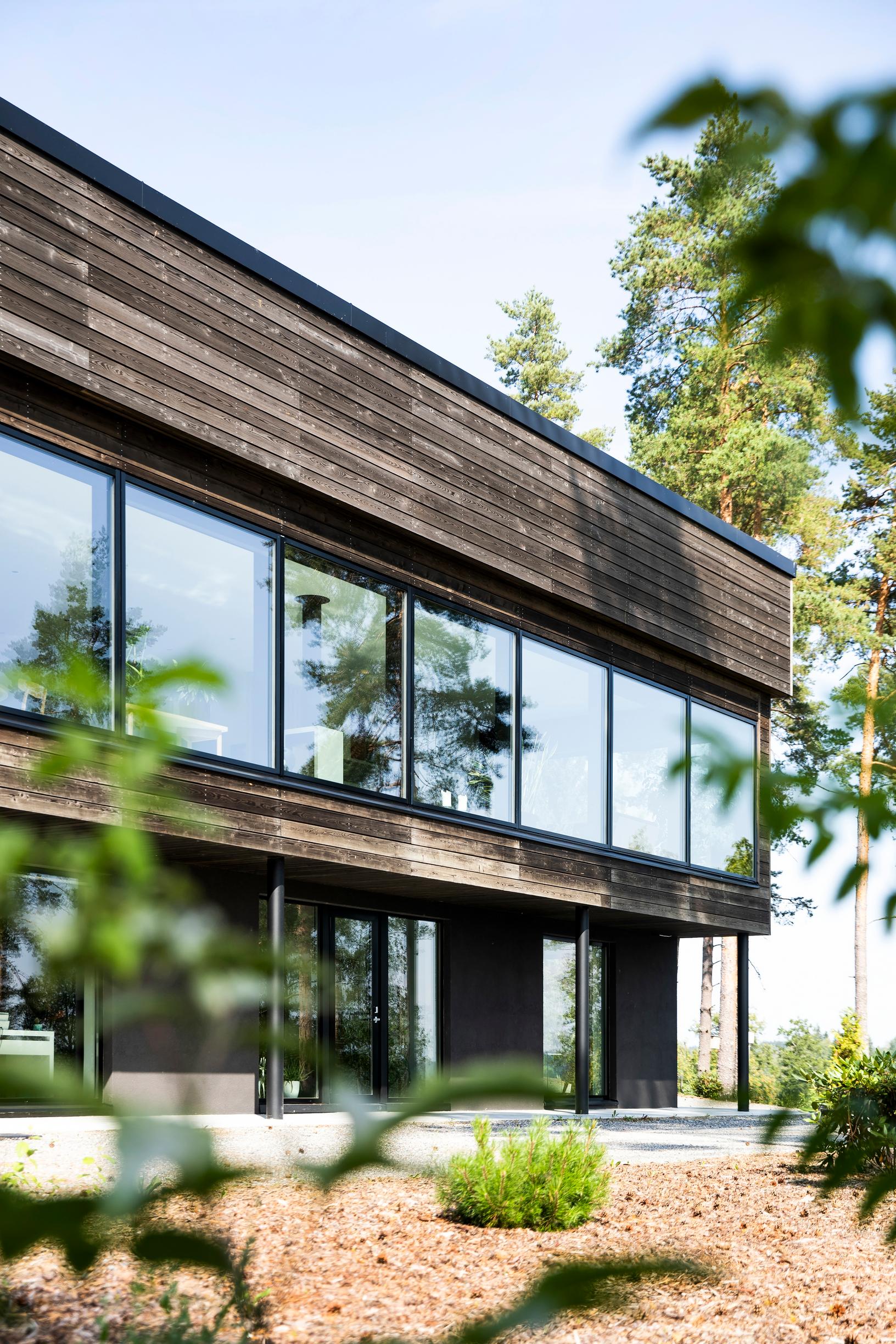 – Asumiskuviomme muuttuivat yllättäen, kun toinen tuttavaperhe kertoi, että voisi koska tahansa ostaa meidän puutalomme. Vanha unelma asumisesta järven rannalla alkoi kutkuttaa, ja me aloitimme suunnittelutyön. Tontille sopi ehdottomasti talo, joka ei huuda olemassaoloaan vaan mukautuu luontoon. Siperianlehtikuusiverhoilu harmaantuu vähitellen, Janne sanoo.