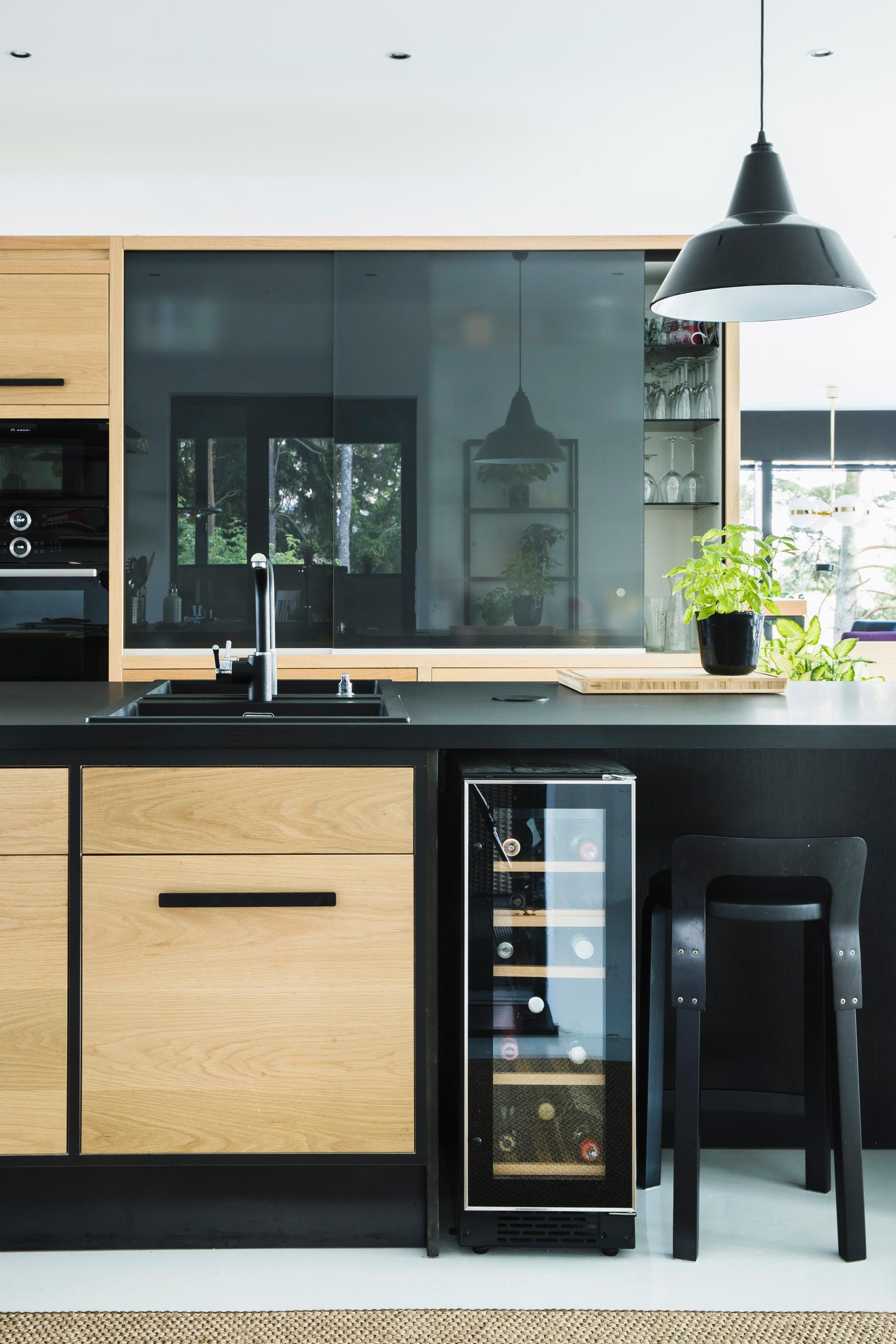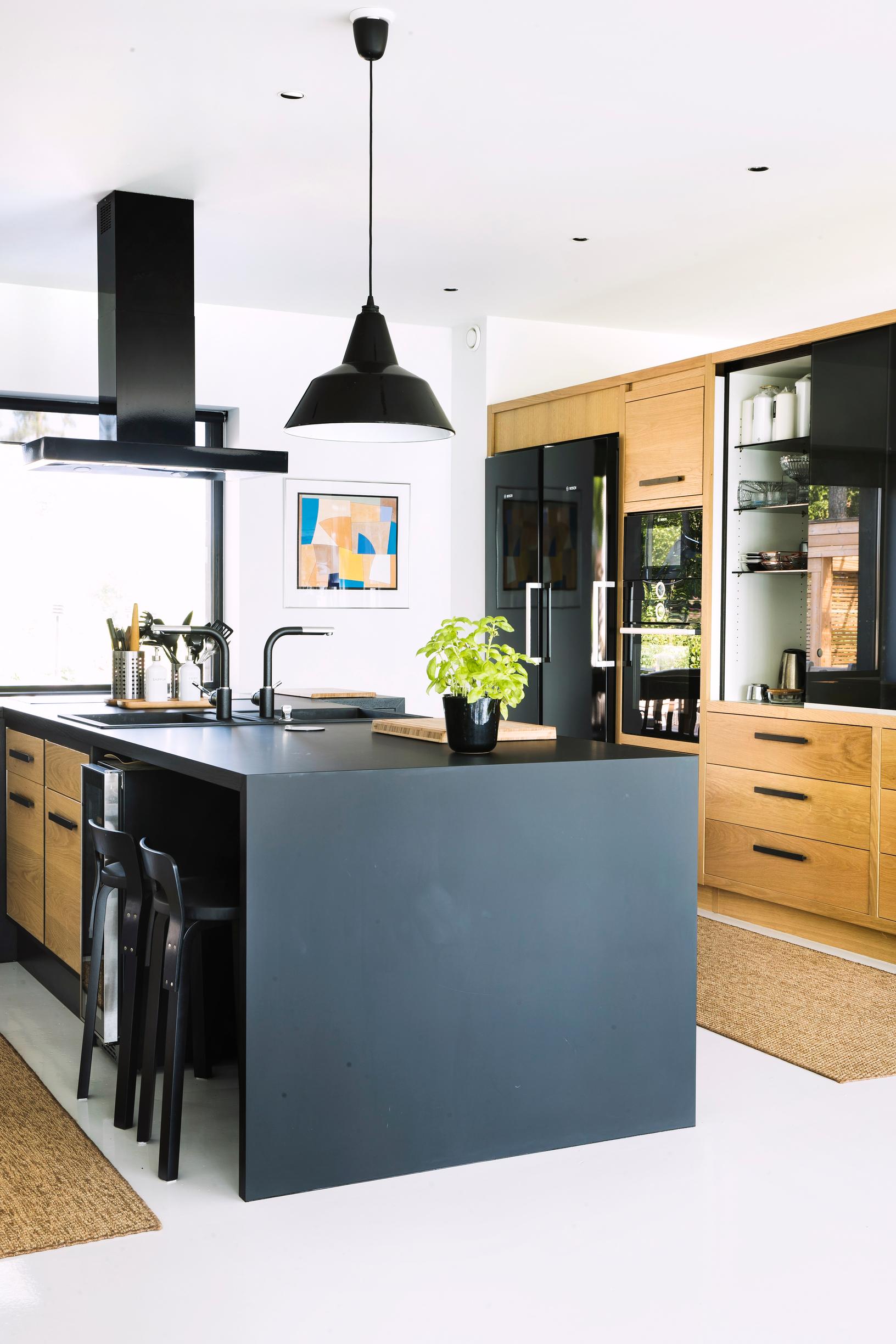 – Keittiökin suunniteltiin porukalla. Olimme tekemässä Samulin kanssa kahdeksan metrin pituista saareketta, kunnes Heli tuli sanomaan, että puoletkin riittää. Lopputulos on onnistunut kompromissi, Janne kertoo.