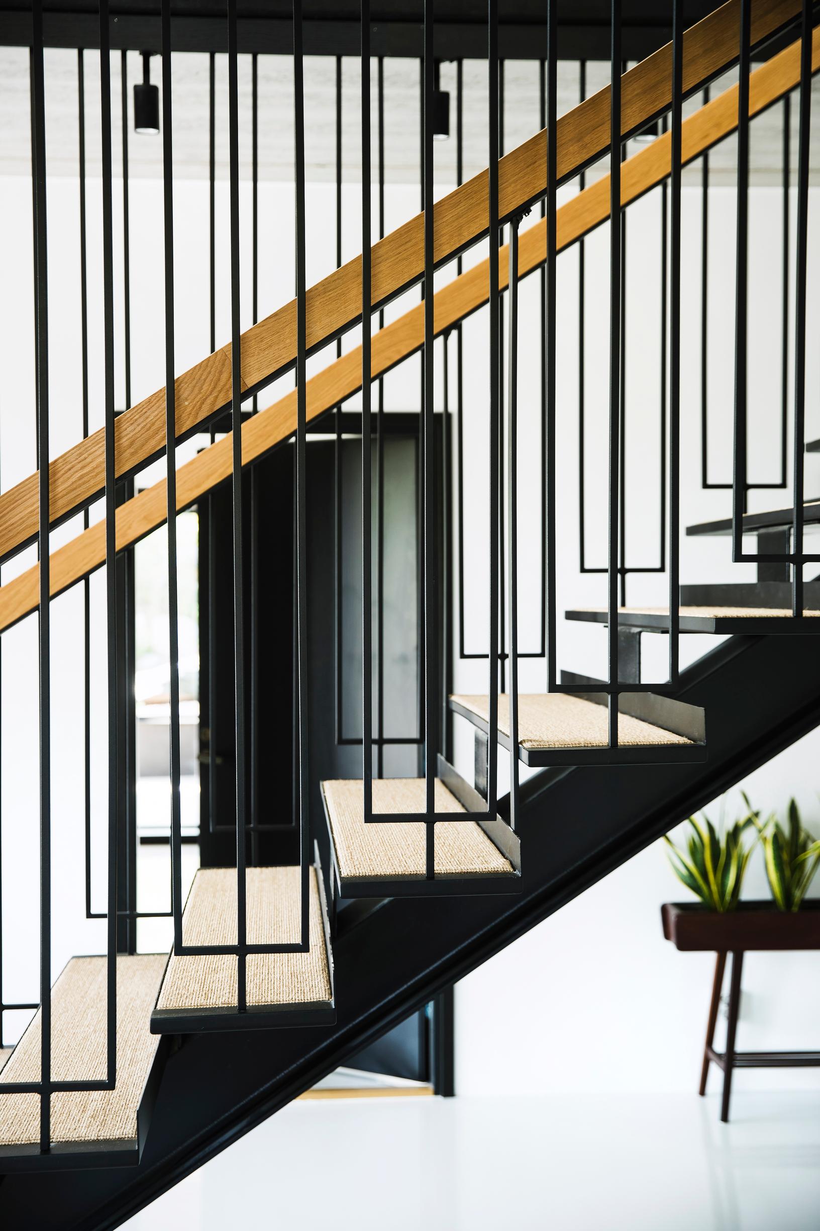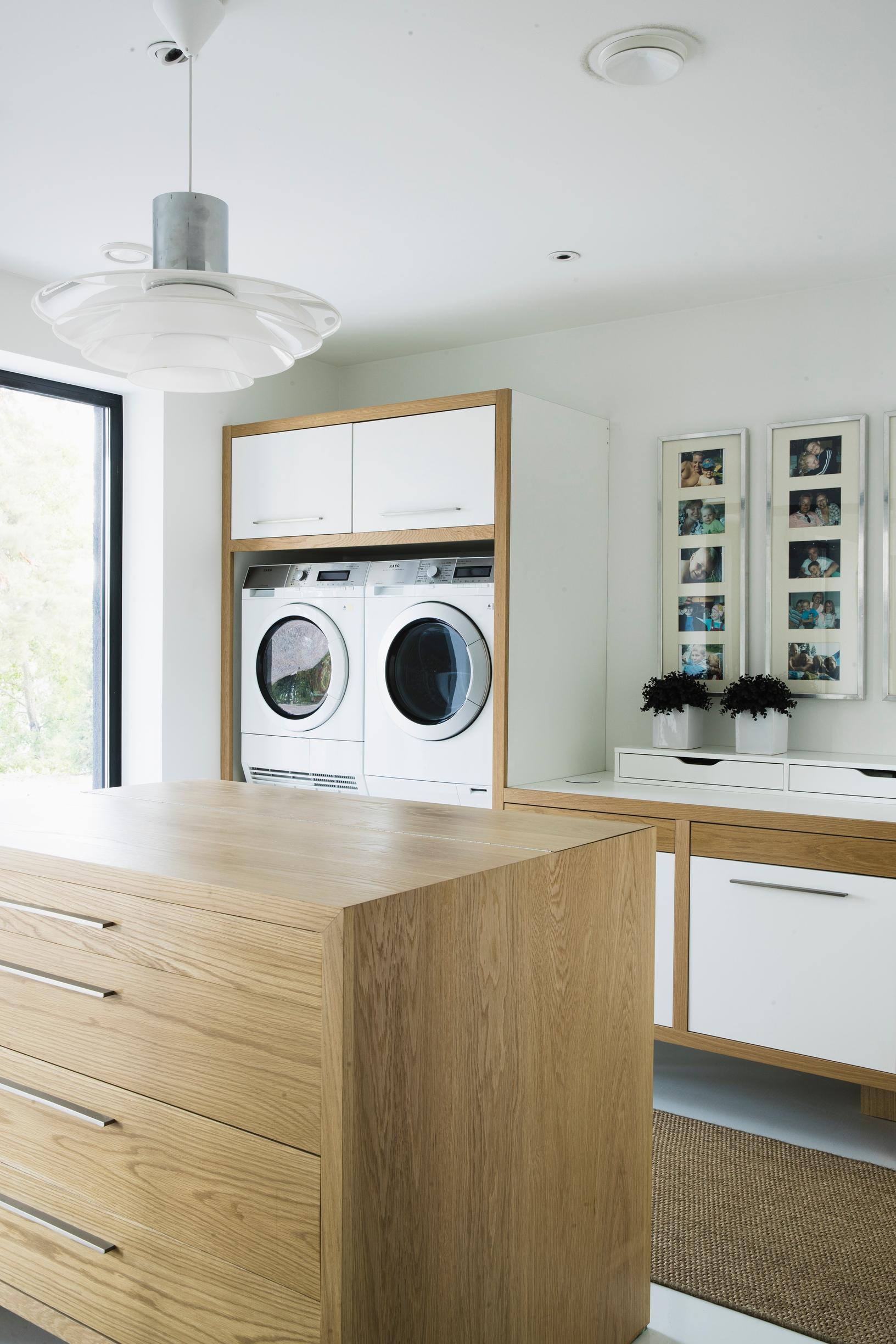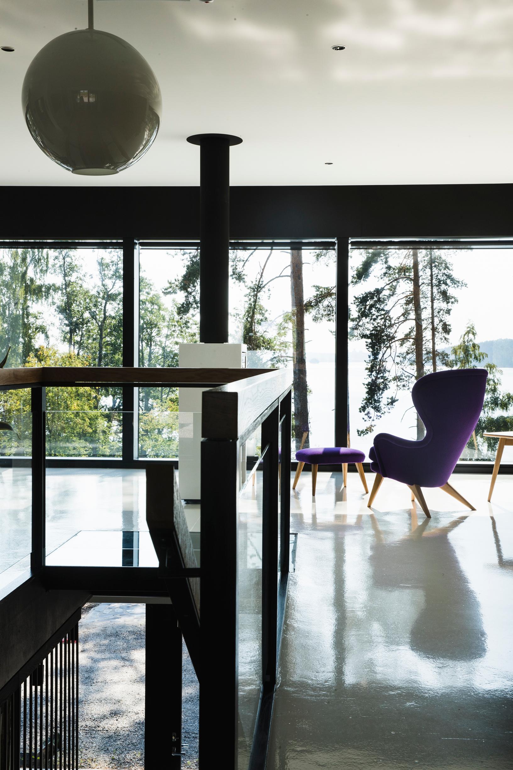 Kiintokalusteet, kuten sauna, keskelle taloa sijoitettu teräsportaikko sekä vaatekaapit ja tasot ovat Fasetin omaa suunnittelua ja tehty omalla verstaalla huonekalujen tapaan.