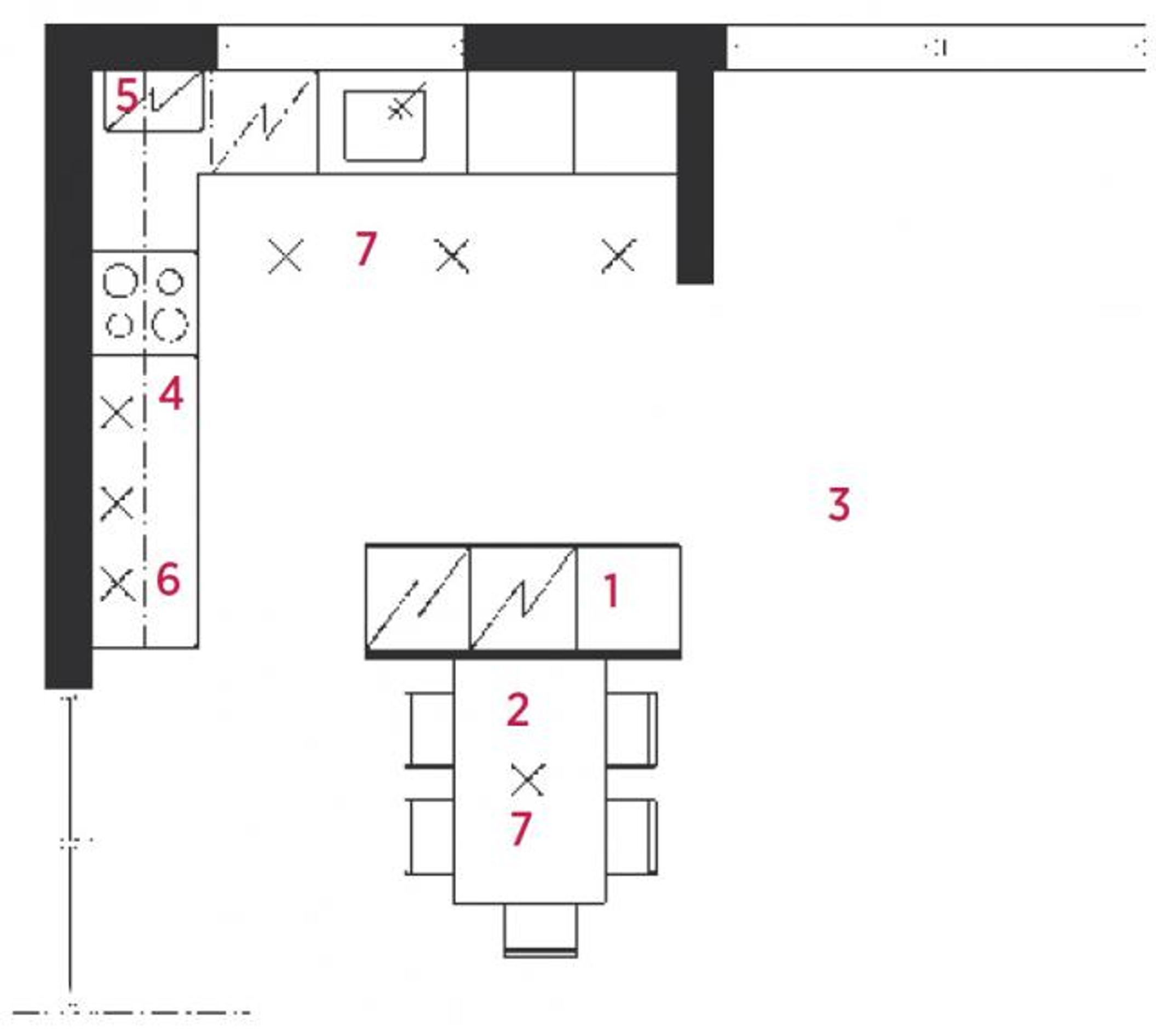 Työtason päälle tarvitaan hyvä valo, esimerkiksi led-nauha. Kattoon sopii tehokas plafondi tai rivi kohdevalaisimia. Pöydän päälle käy roikkuva malli, joka valaisee sivuillekin. Tarkista keittiötä suunnitellessa myös sähköpistokkeiden paikat ja määrä. Pienkoneita varten tarvitaan monta pistorasiaa. Ne voi sijoittaa pöytäkaapin sisään, yläkaapin alapintaan tai sen takaseinälle.