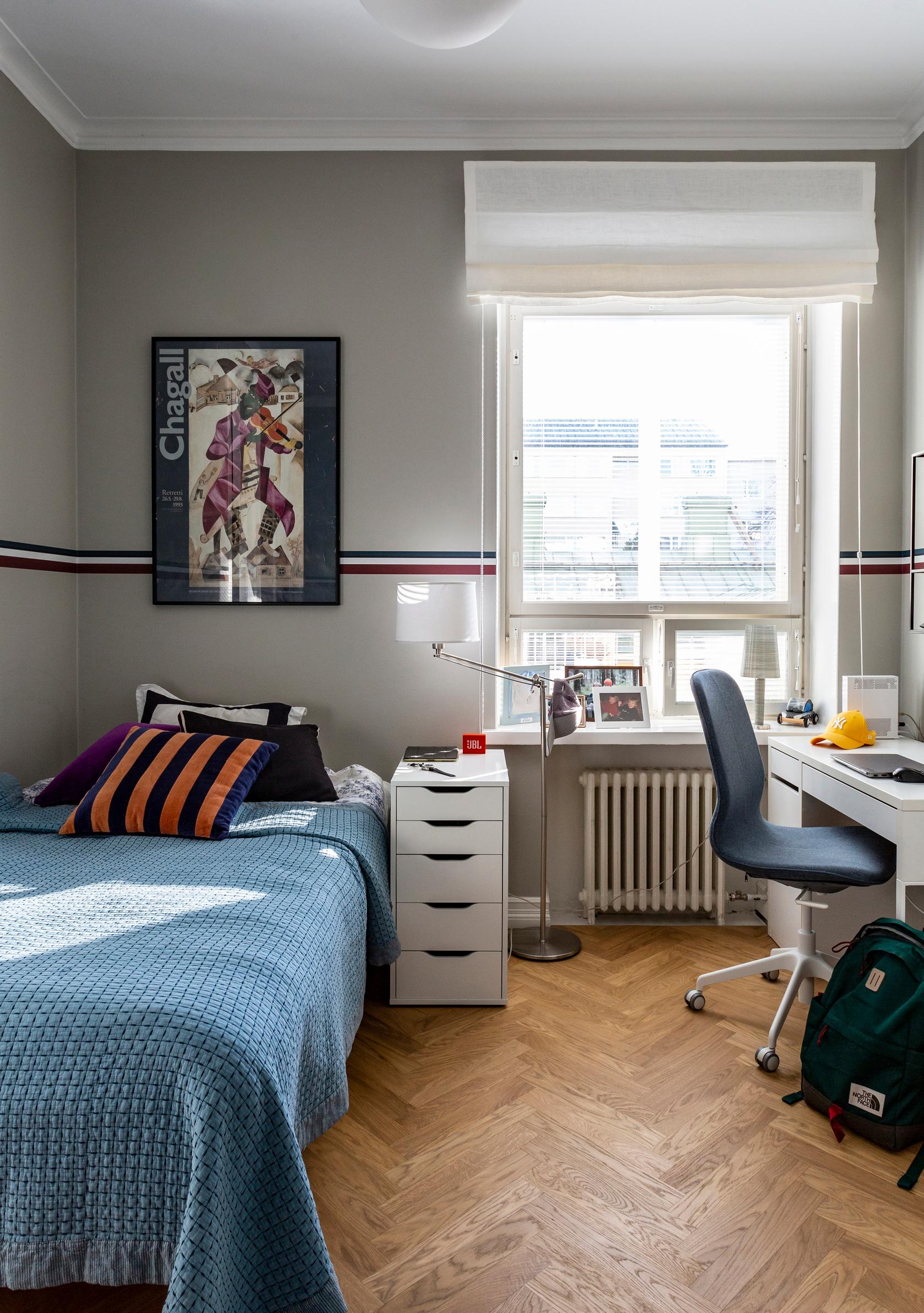 Mieleistä kolmen neljän makuuhuoneen asuntoa ei ollut helppo löytää. Vanhoissa taloissa huoneet ovat usein isoja ja on käytävää ja hukkaneliöitä, jolloin neliömäärä kasvaa helposti suureksi. Edellisessä kodissa oli paljon tiloja, joita perhe ei juuri koskaan käyttänyt. Tämä Jääkärinkadun-asunto, sen tunnelma ja tehokkaat 130 neliötä tuntuivat heti täydellisiltä.
