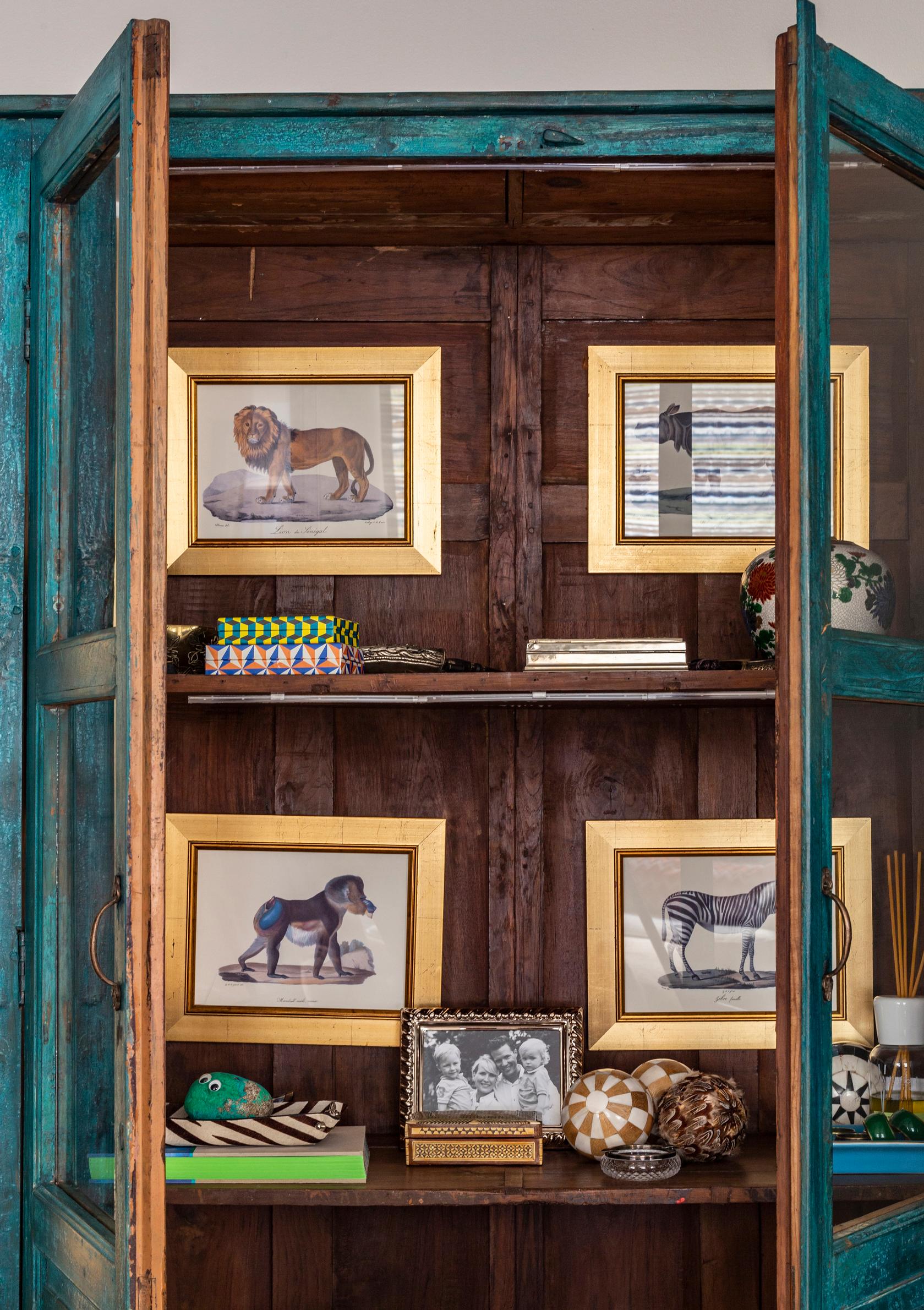 Uudessa kodissa riittää ihailtavaa, on rohkeita väriyhdistelmiä ja kekseliäitä yksityiskohtia. Anna on uudistanut tauluja luottokehystäjänsä kanssa uusilla kehyksillä ja paspartuureilla ja saanut näin klassisiin vanhoihin kuviin tuoretta jujua. Vanha lasiovinen puukaappi on saanut taulut takaseinälle ja piilotetun ledinauhan valaistukseksi.