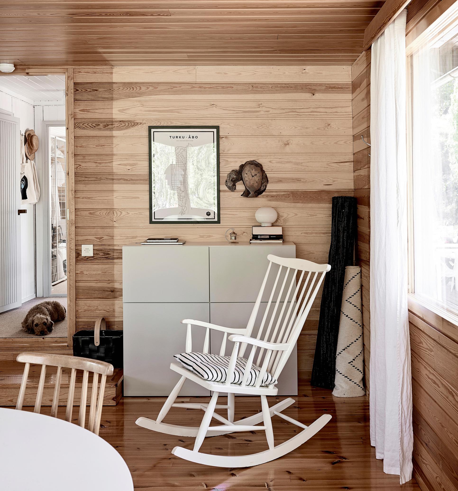 Ajatuksena oli luoda rento mutta moderniin kakkoskotoiluun sopiva tunnelma. Skandinaavinen tyyli tuntuu omalta, ja kierrätetyt kalusteet ovat tyylini kivijalka niin kotona kuin täällä mökillä.