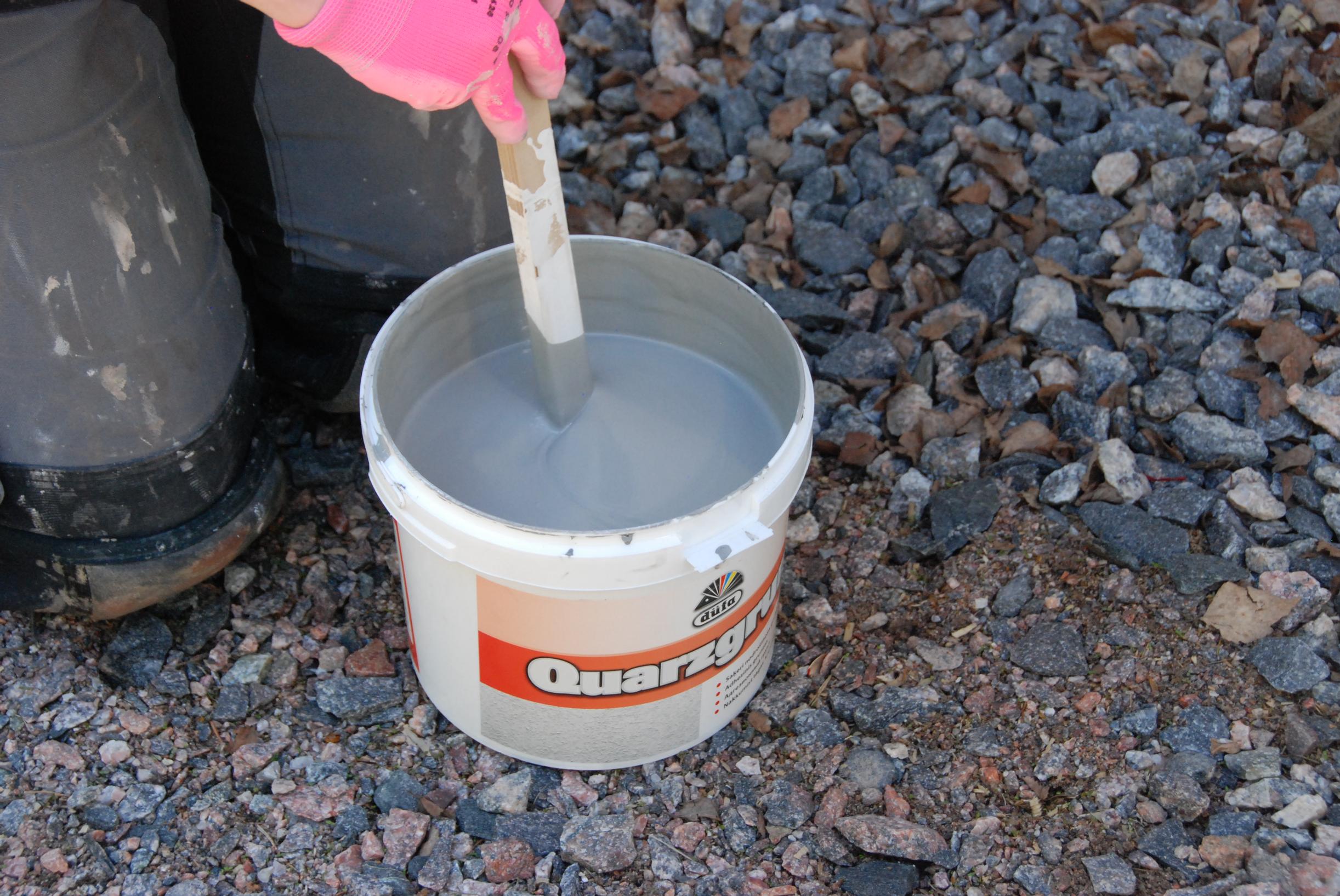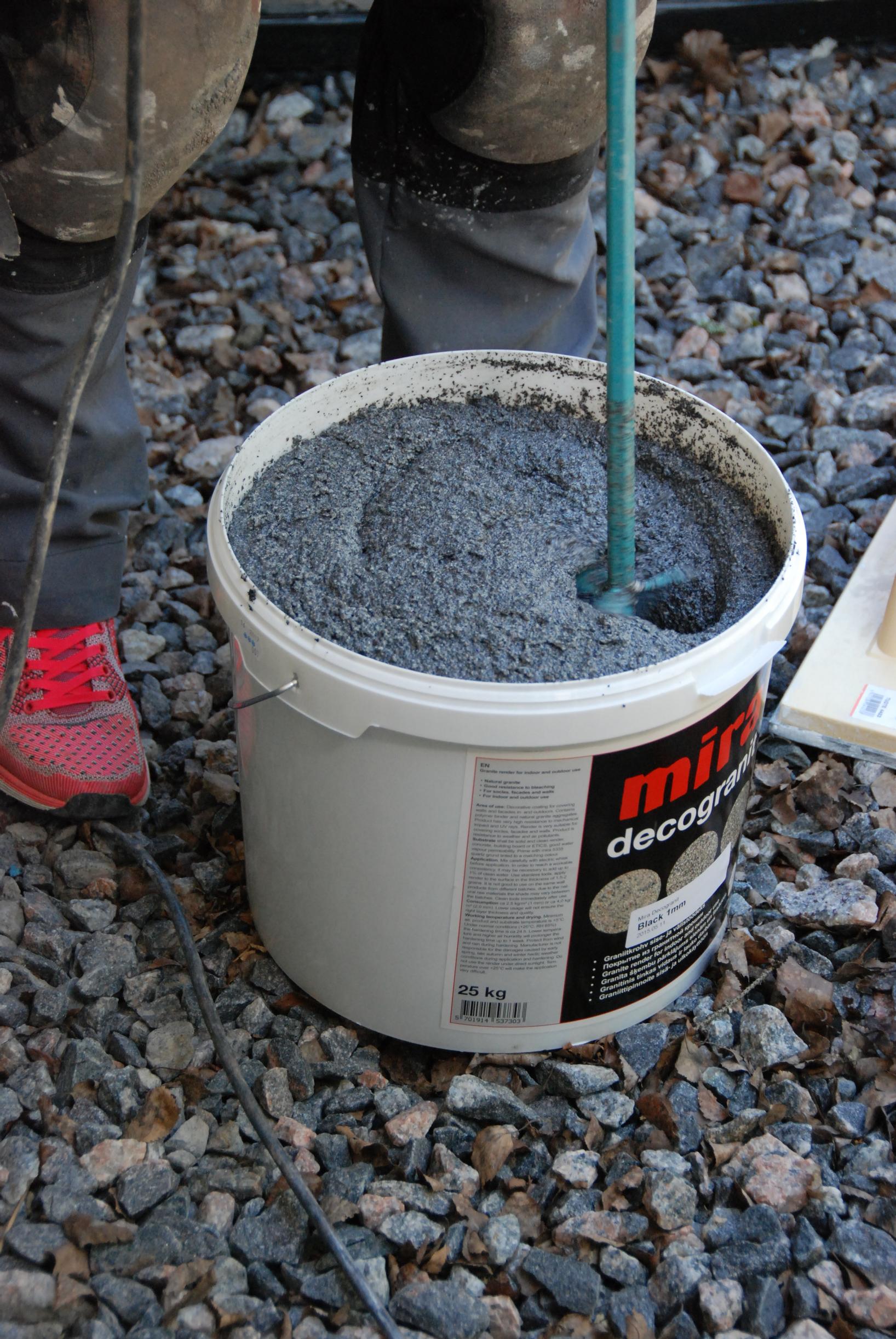5. Tarkista, että pohjamaali on varmasti kuiva ennen kuin aloitat pinnoitteen levittämisen. Kun sekoitat pinnoitetta, näet sen mukana olevan hienojakoisen kiviaineksen pieninä muruina. Nimenomaan kiviaines tekee pinnasta lopulta elävän näköisen.