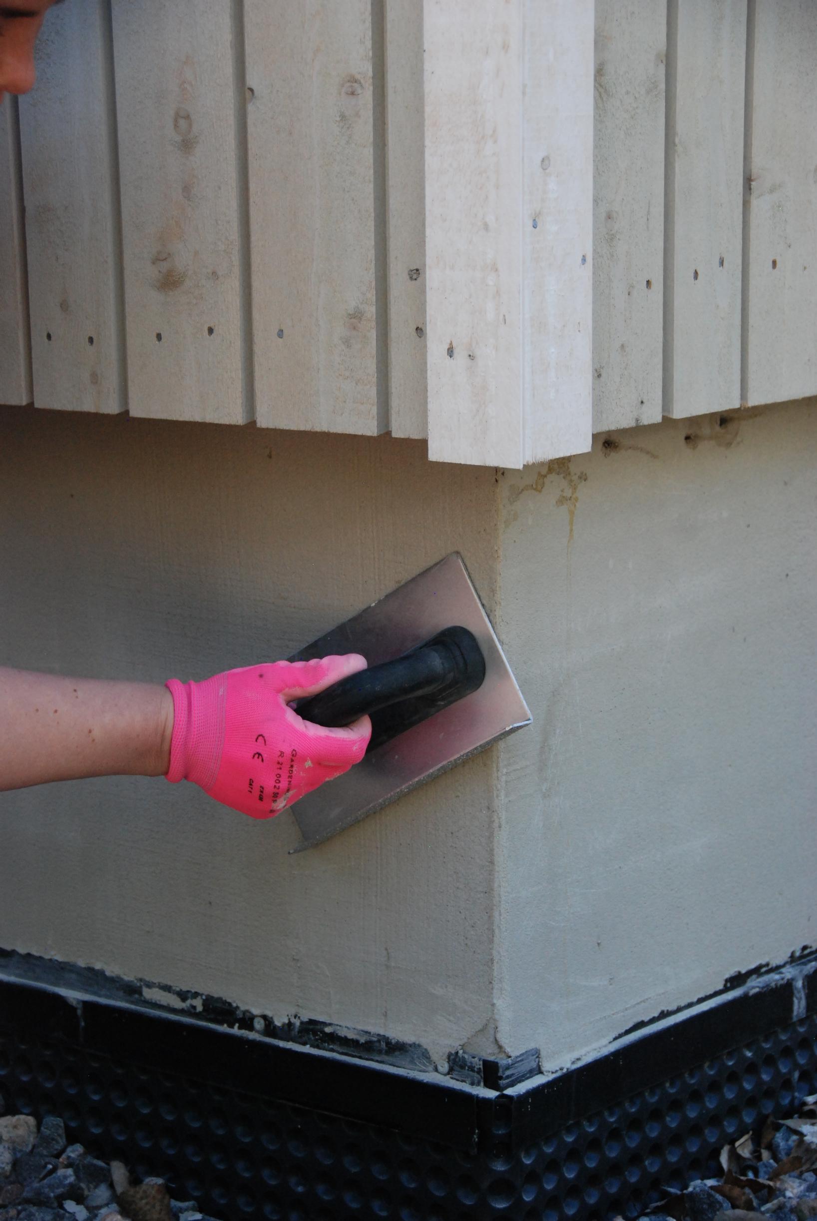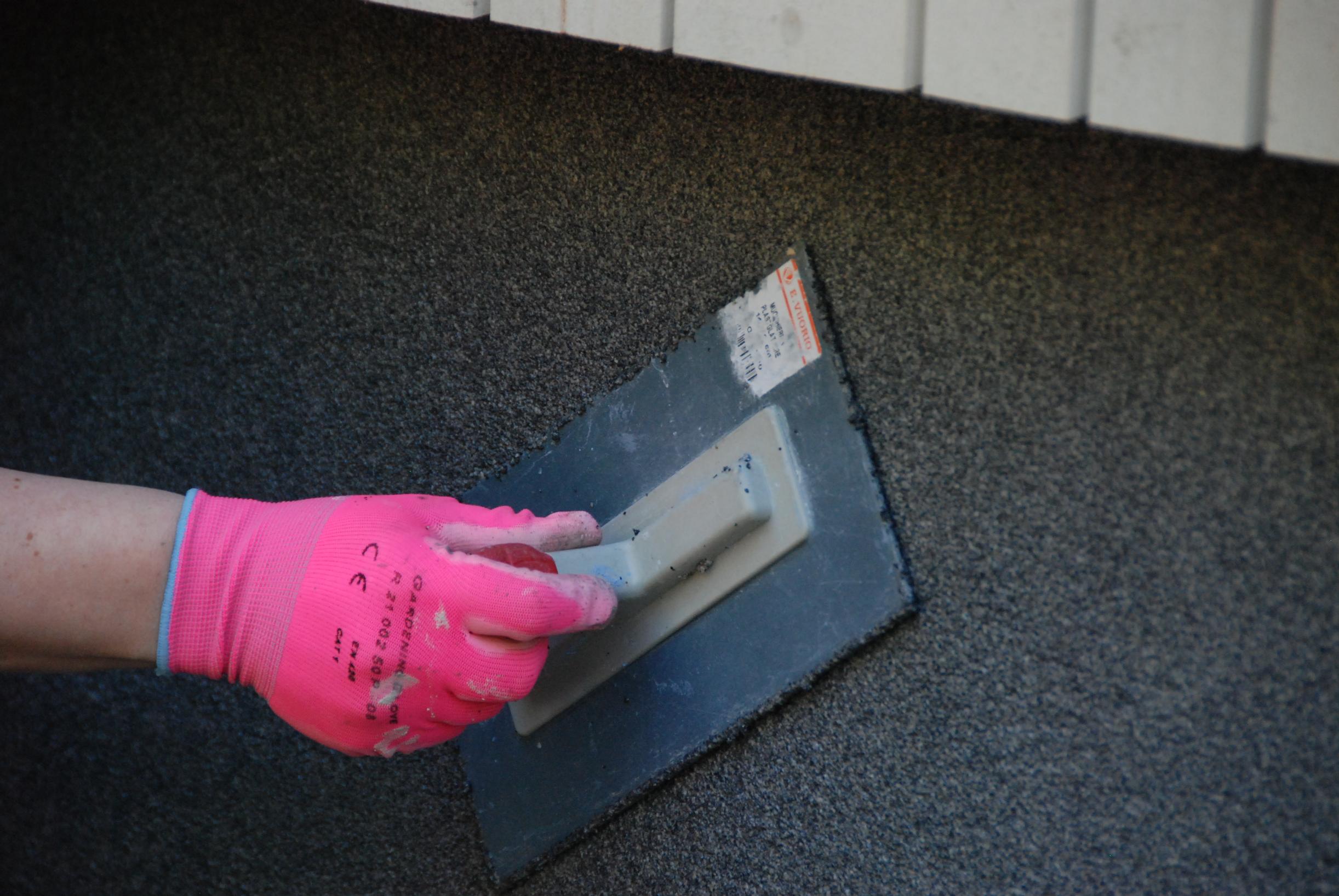 6. Levitä pinnoite sokkelin pintaan hiertopinnoitteen kiviaineksen vahvuuden mukaan. Tässä massassa kivirouheen halkaisija on vain yhden millimetrin. Tavoite on, että kivirouhe levittyy mahdollisimman tasaisesti. Varaa työhön erikokoisia pakkelilastoja ja liippoja, mutta voit levittää kivirouheen myös solukumisella lastalla. Putsauskauha on hyvä apu ahtaissa paikoissa.