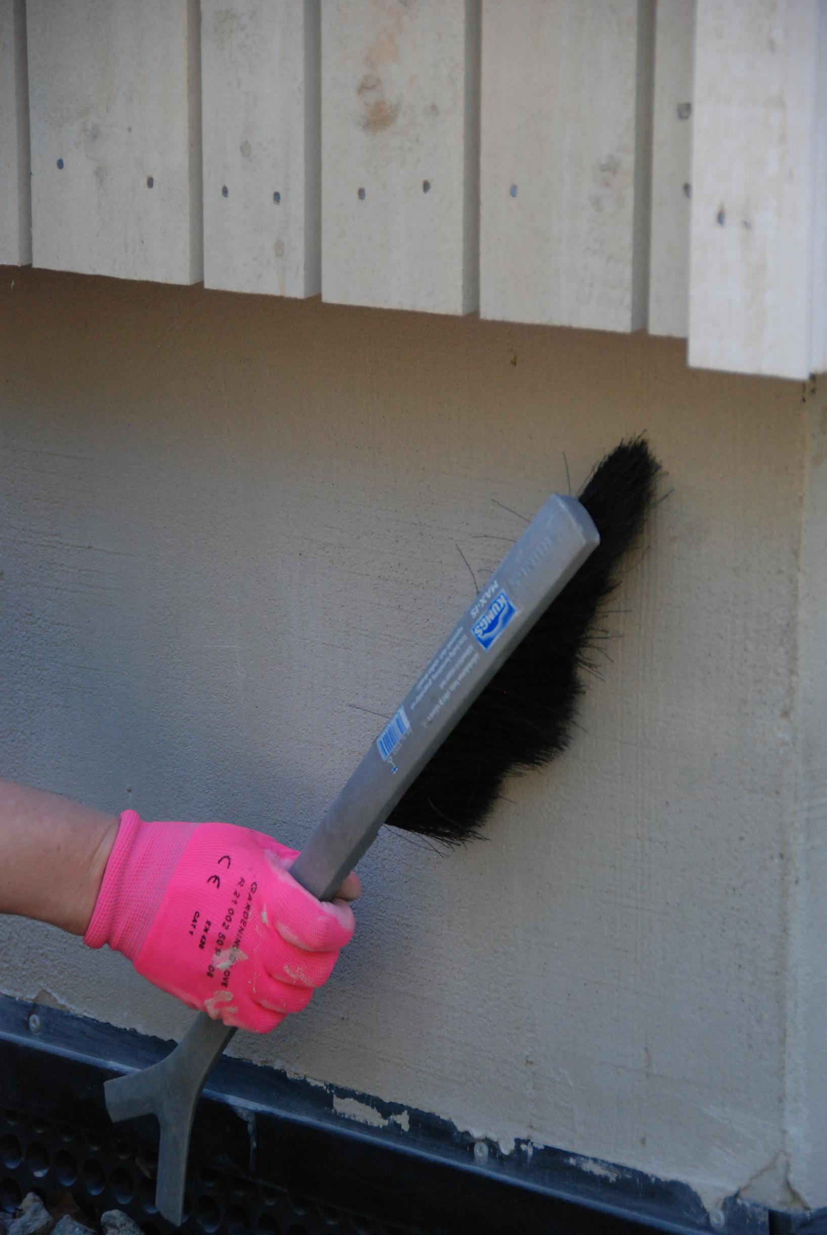 2. Kun olet hionut epätasaisuudet pois, harjaa kivijalka huolellisesti puhtaaksi. Irtonainen aines ja hieno pöly heikentävät merkittävästi pinnoitteen tarttumista. Myös sokkelin viereen satanut vesi heittää usein rapaa kivijalkaan.