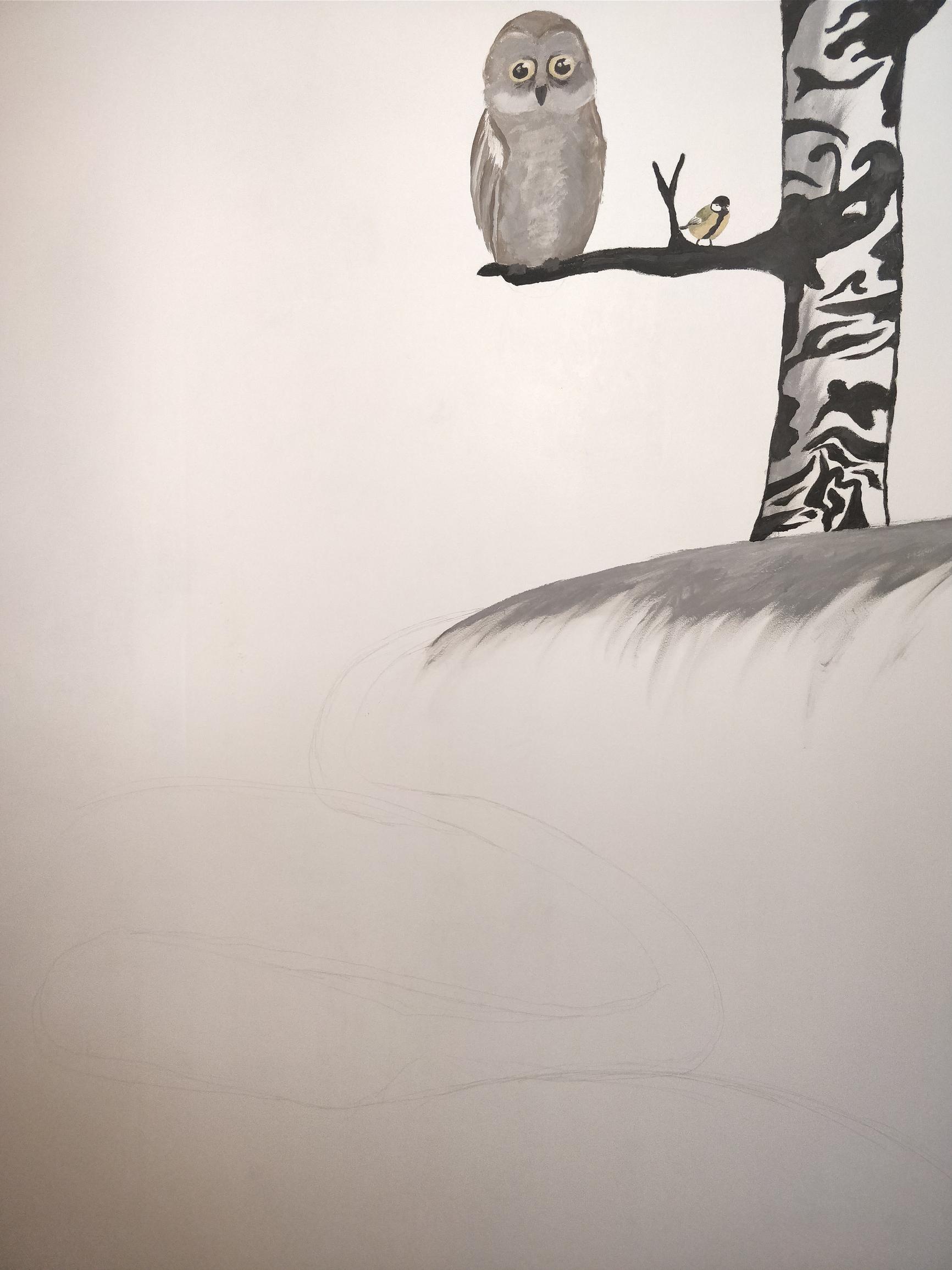 "Koska tein maalausta todella hitaalla tahdilla, minulla oli aikaa miettiä eikä virheitä juurikaan tullut. Muutamaa eläintä, kuten oksalla olevaa pöllöä, jouduin korjailemaan. Kalkkimaalin voi pyyhkiä kostealla pois, joten virheet oli helppo korjata. "