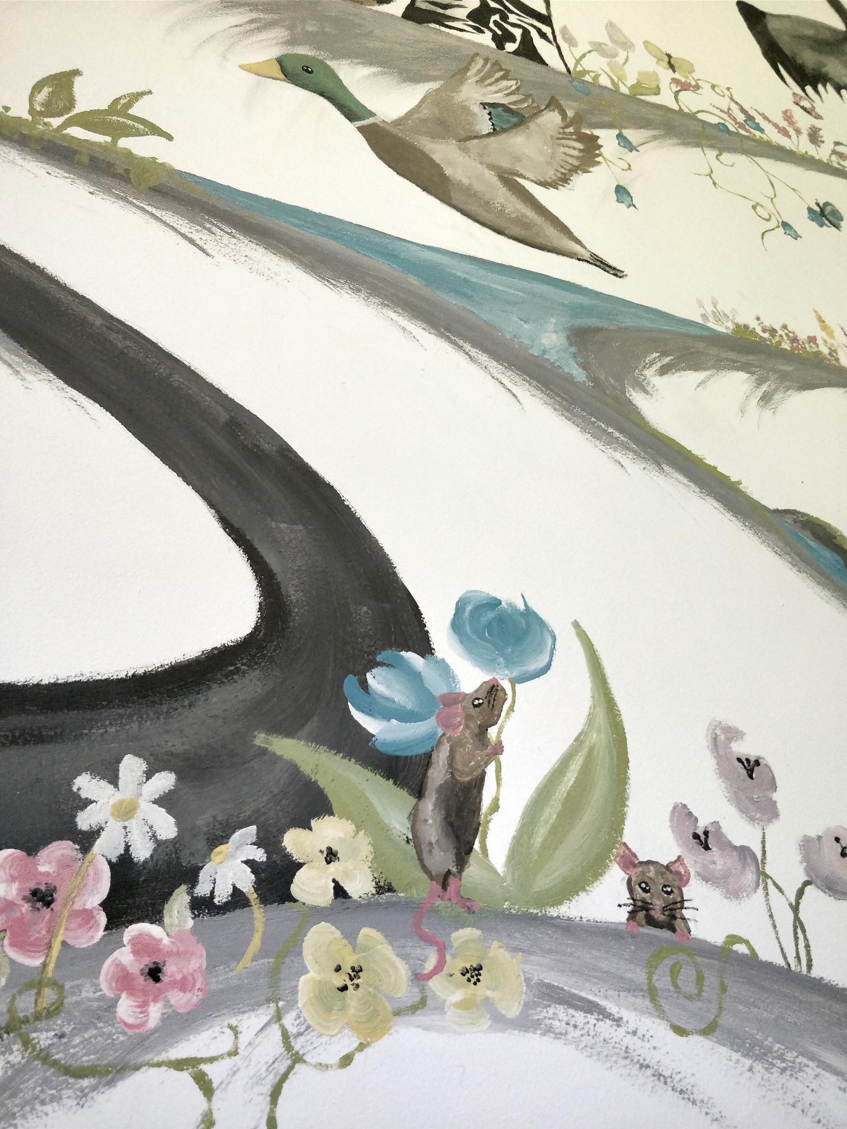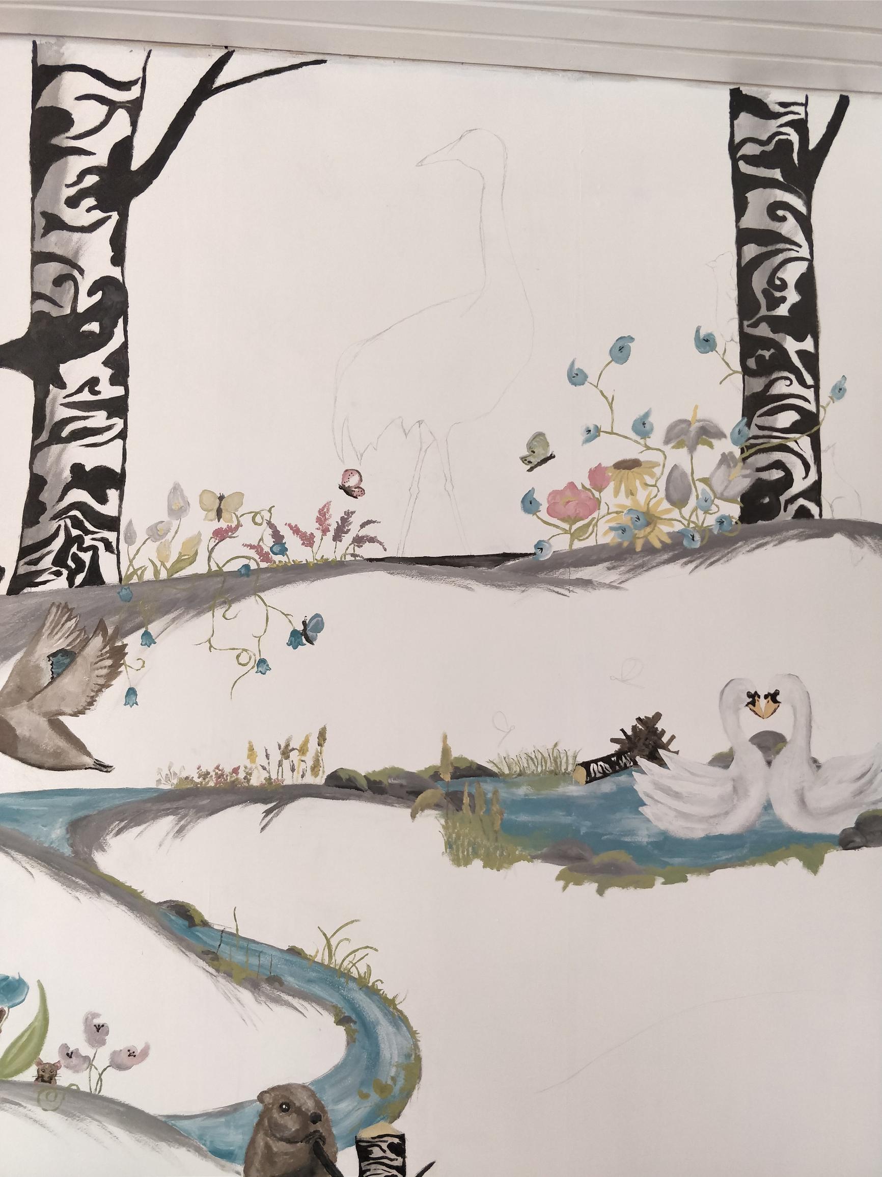 "Aloitin työn poistamalla vanhan tapetin seinästä ja maalasin pohjaväriksi valkoisen. Seuraavaksi piirsin lyijykynällä suurpiirteisen muodon, jonka sisään aloin maalaamaan. Eläinten kokoa oli helpompi hahmotella kynällä ensin. Maalasin eteenpäin sitä mukaa, kun päätin, mitä haluan tehdä seuraavaksi. En piirtänyt lyijykynällä koko seinää kerralla, vaan aina ideoiden mukaan, pikkuhiljaa."